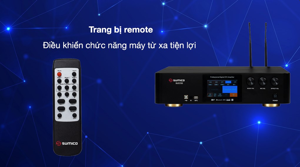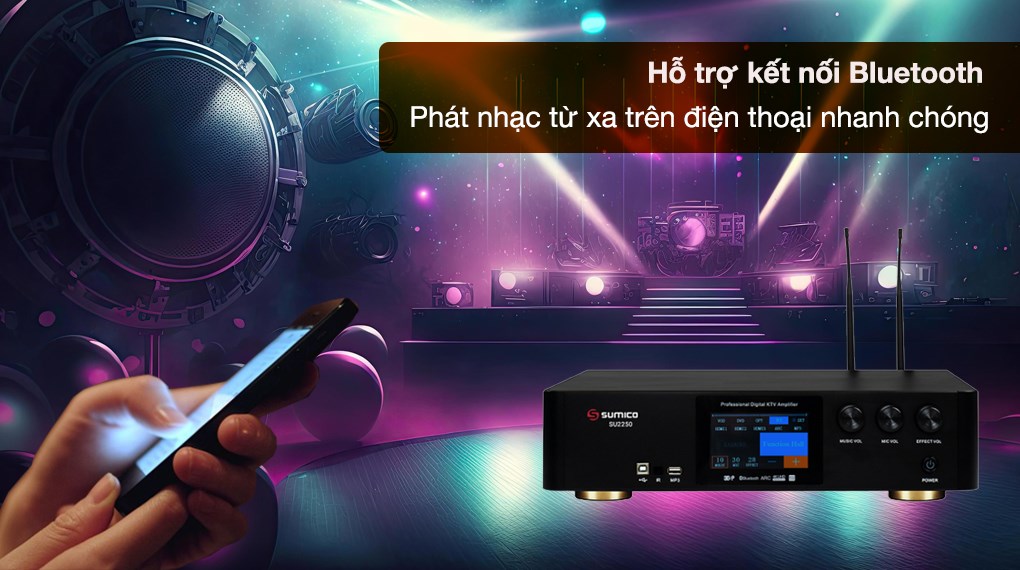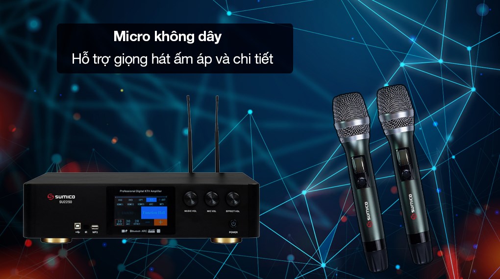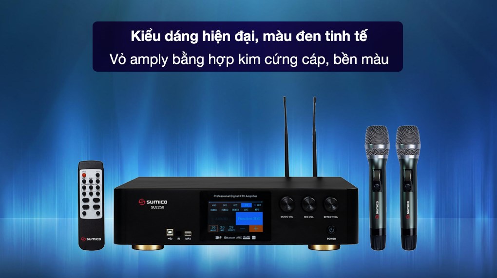 Ampli karaoke Sumico SU2250 tích hợp Micro không dây và vang số dùng bộ xử lý âm thanh kỹ thuật số 3DSP thông minh với khả năng lọc âm và chống hú rít cực tốt cho bạn thoải mái ca hát, nghe nhạc và xem phim với chất lượng hoàn hảo.