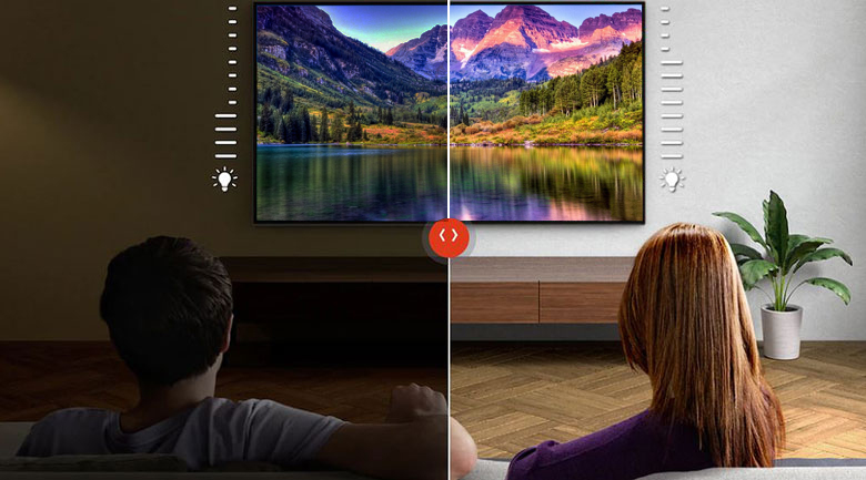 Tivi có cảm biến ánh sáng tối ưu hóa độ sáng theo ánh sáng trong phòng (tăng độ sáng trong phòng sáng và giảm độ sáng trong phòng tối). Với công nghệ này, tivi còn phát hiện các vật thể trong không gian đặt tivi từ đó tăng cường và tối ưu âm thanh cho âm thanh, hình ảnh hoàn toàn hòa hợp với môi trường, cho bạn thưởng thức thú vị, lôi cuốn.
