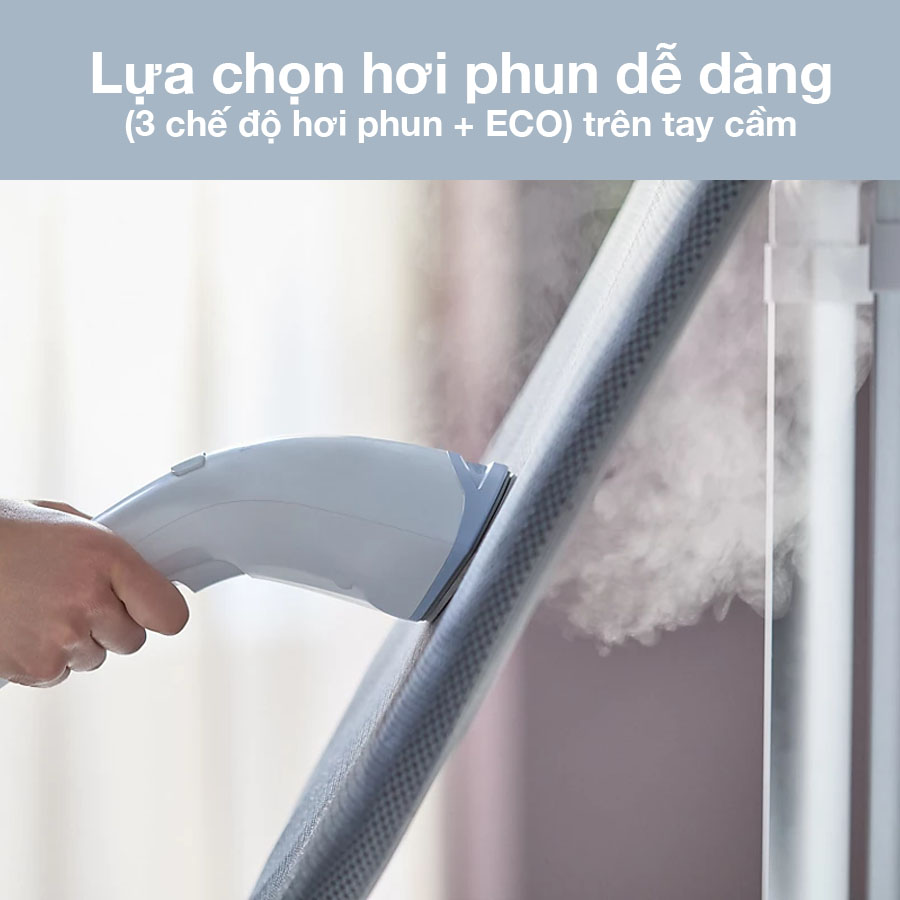 Sản phẩm có nút nhấn để điều chỉnh được 3 chế độ hơi phun gồm: hơi phun thấp dành cho loại vải mỏng, hơi phun cao thì các loại vải dày và áo khoác. Chế độ hơi phun ECO giúp giảm lượng tiêu thụ điện, tiết kiệm chi phí.