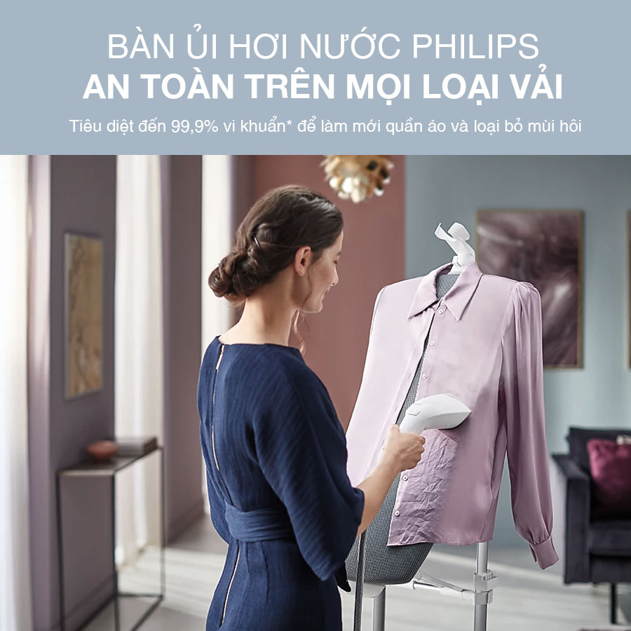 Thiết bị có công nghệ làm nóng kép tiên tiến với công suất lớn 2200W, làm nóng nhanh tạo ra hơi phun mạnh, thấm sâu, và quần áo sẽ được ủi thẳng mà không để lại vệt nước. Nhờ vậy, thiết bị có thể khử trùng bề mặt vải và diệt 99.9% vi khuẩn.