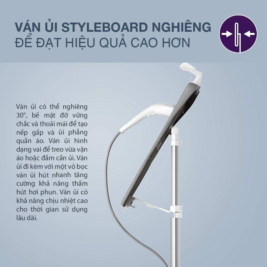 Bên cạnh đó, thiết bị còn có thêm ván ủi nghiêng 30 độ, chịu nhiệt tốt. Giúp bạn ủi đồ tiện lợi hơn rất nhiều. Đầu ủi được thiết kế chính xác gấp 3 lần, cho phép làm phẳng những nơi như cổ áo, vai và các nút ở giữa.