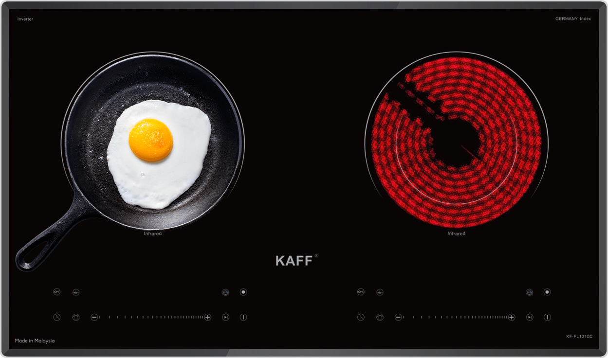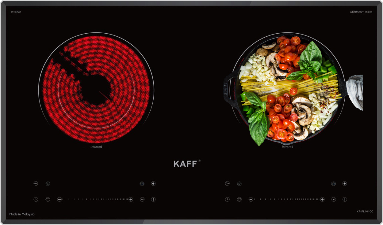 Bếp điện Kaff KF-FL101CC gồm 2 vùng nấu hồng ngoại với tổng công suất là 4400W. Vùng nấu hồng ngoại trái trang bị mâm nhiệt cao cấp E.G.O Hi-light với 02 vòng nhiệt có công suất tối đa là 2200W. Vùng nấu hồng ngoại phải trang bị mâm nhiệt cao cấp E.G.O Hi-light với 02 vòng nhiệt có công suất tối đa là 2200W. Bếp hoạt động theo nguyên lí bức xạ nhiệt của tia hồng ngoại, đốt nóng mặt kính và truyền nhiệt qua đáy nồi và làm chín thức ăn bên trong. Nhờ nguyên lí hoạt động này nên bếp hoàn toàn không kén nồi, bạn có thể sử dụng tất cả các loại xoong nồi có sẵn trong gia đình.