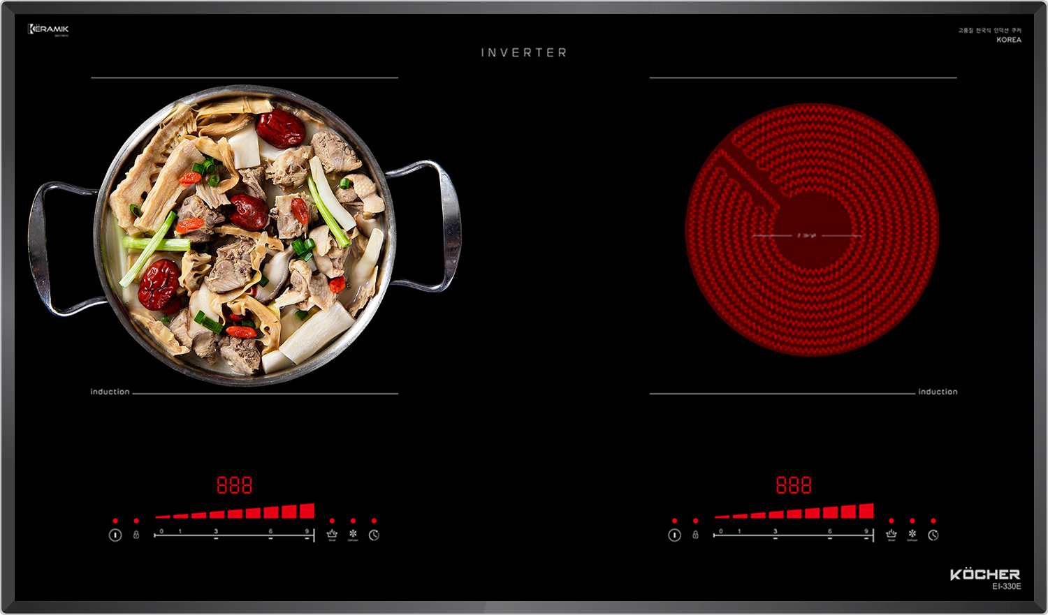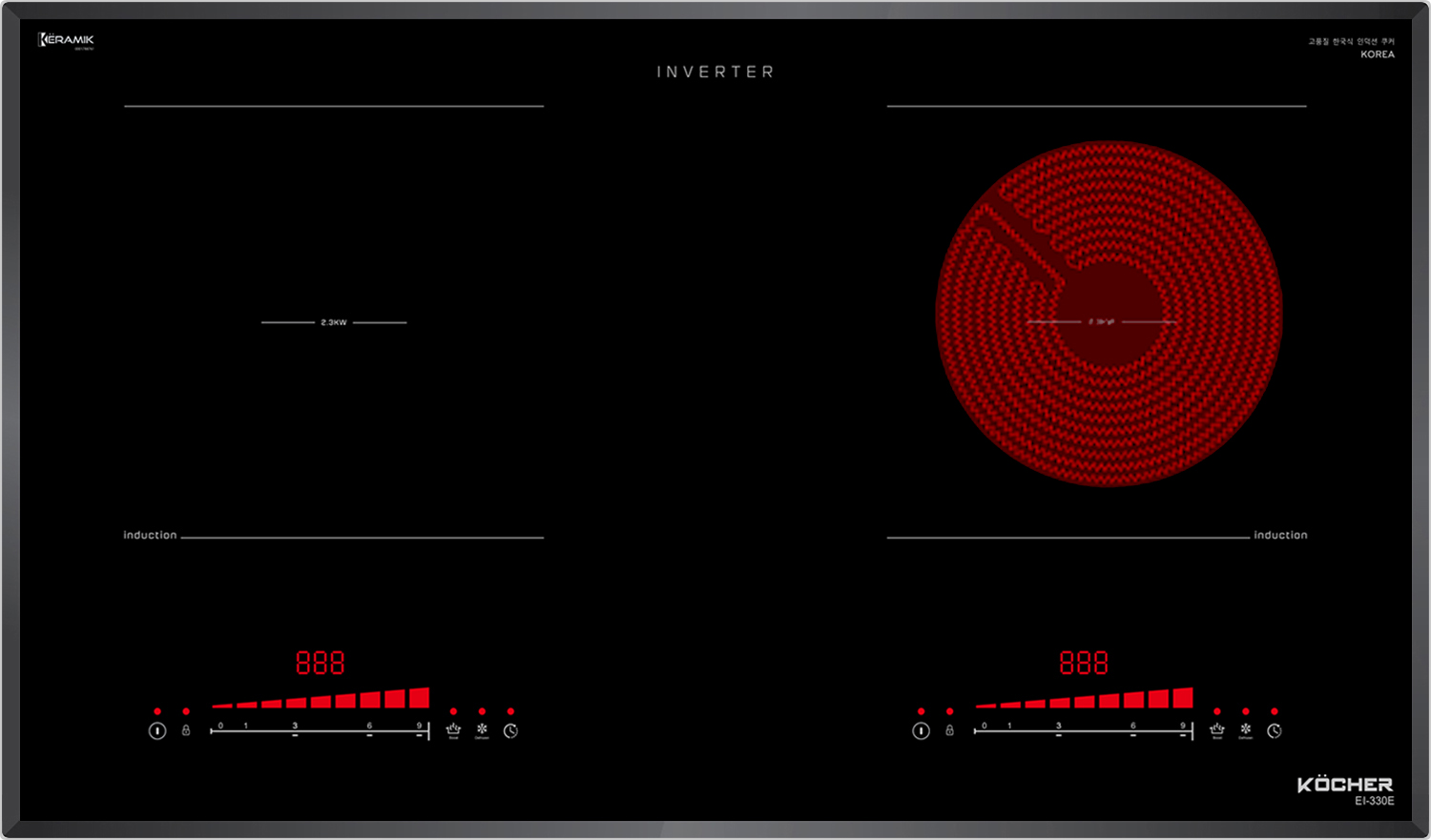 Bếp điện từ Kocher EI-330E gồm 2 vùng nấu với tổng công suất là 4300W. Vùng nấu từ trái có công suất là 2000W khi kích hoạt tính năng nấu siêu nhanh Booster công suất lên tới 2300W. Vùng nấu hồng ngoại phải trang bị mâm nhiệt Hi-light 2 vòng nhiệt với công suất là 2000W.