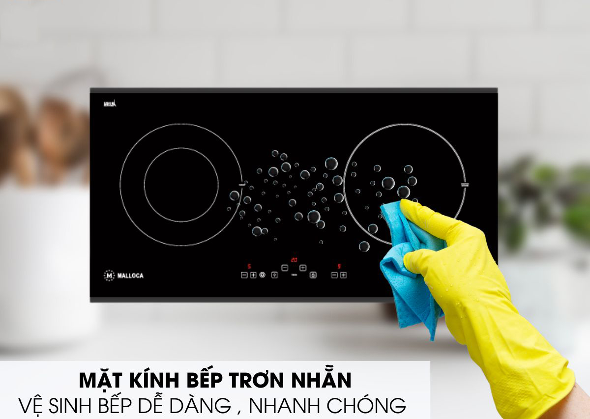 Mặt kính: Sản phẩm sử dụng mặt kính Eurokera mang đến nhiều tính năng, đặc biệt nhất là khả năng chịu nhiệt, chịu lực, chống va đập, trầy xước tốt, bền bỉ với thời gian. Sản phẩm làm từ thuỷ tính gốm sứ này có thể chịu được sốc nhiệt lên tới 700°C (1300°C) và các biến đổi nhiệt khắc nghiệt nhất. trong quá trình vệ sinh bếp điện từ malloca bạn cần sử dụng dung dịch tẩy rửa chuyên dụng để bảo vệ bề mặt kinhs của bếp tránh bị ăn mòn
