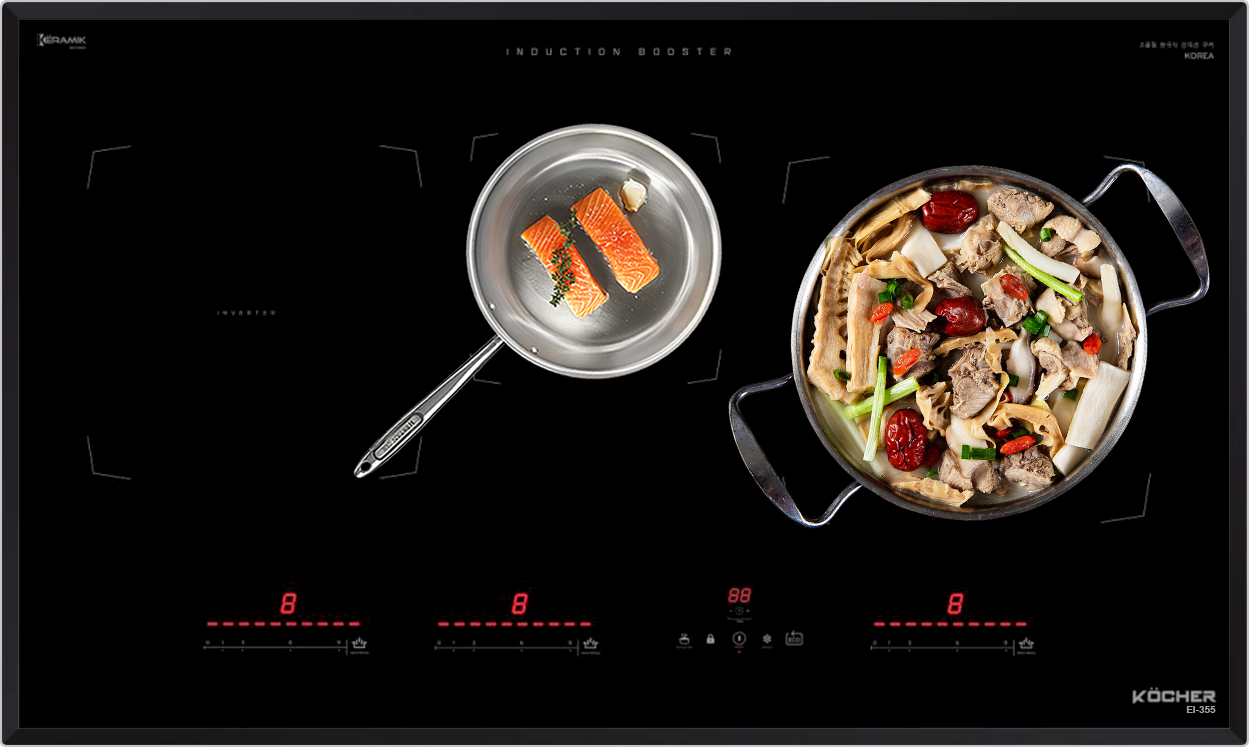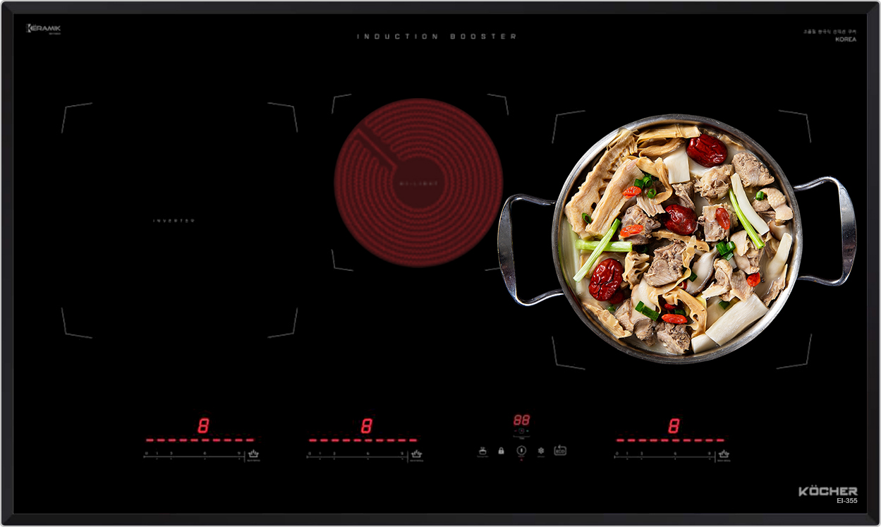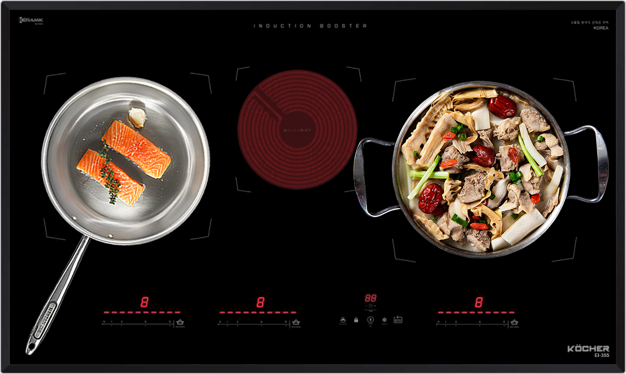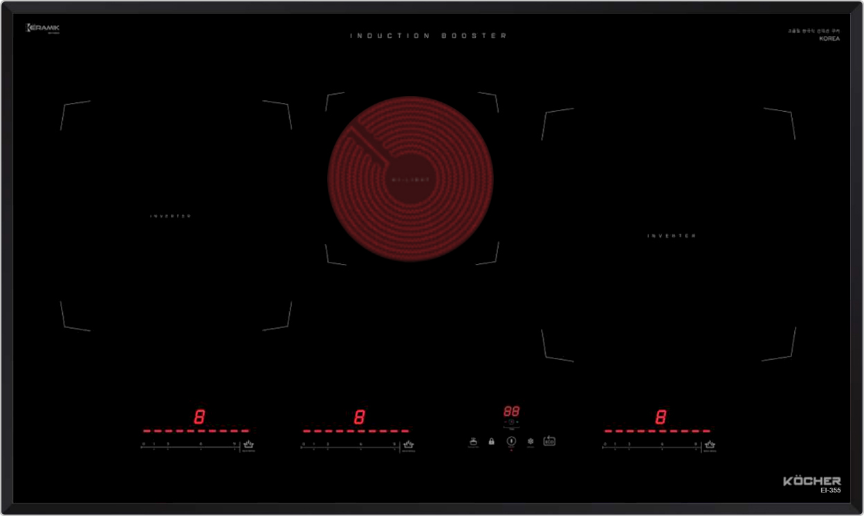 Bếp điện từ Kocher EI-355 gồm 3 vùng nấu với tổng công suất là 5500W. Vùng nấu từ trái có công suất là 1800W khi kích hoạt tính năng nấu siêu nhanh Booster công suất lên tới 2000W. Vùng nấu hồng ngoại giữa có công suất là 1500W. Vùng nấu từ phải có công suất là 1800W khi kích hoạt tính năng nấu siêu nhanh Booster công suất lên tới 2000W.