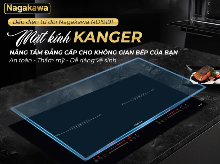 Bếp điện từ đôi Nagakawa NDI9191 sử dụng mặt kính Kanger từ thương hiệu mặt kính nổi tiếng được thiết kế mài vát cạnh tinh tế, mang lại vẻ đẹp hiện đại cho căn bếp của bạn.