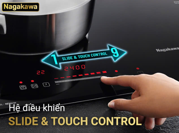 Bếp điện từ đôi Nagakawa NDI9191, bạn có thể lựa chọn cách điều chỉnh tăng giảm công suất bằng cách vuốt di chuyển trái, phải hoặc trực tiếp ấn phím điều chỉnh 9 mức công suất. Thao tác điều khiển bằng cảm ứng nhẹ nhàng, nhạy bén, dễ dàng sử dụng. Màn hình hiển thị rõ ràng, sắc nét giúp bạn dễ dàng theo dõi mức công suất, thời gian nấu nướng và các chức năng khác của bếp.