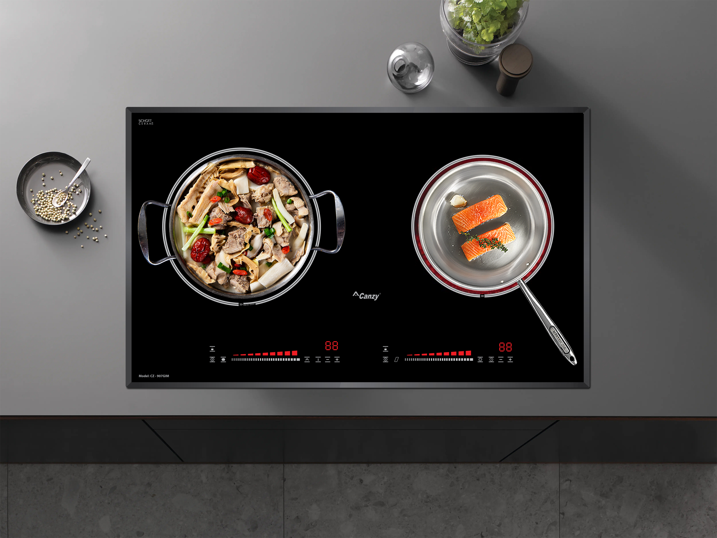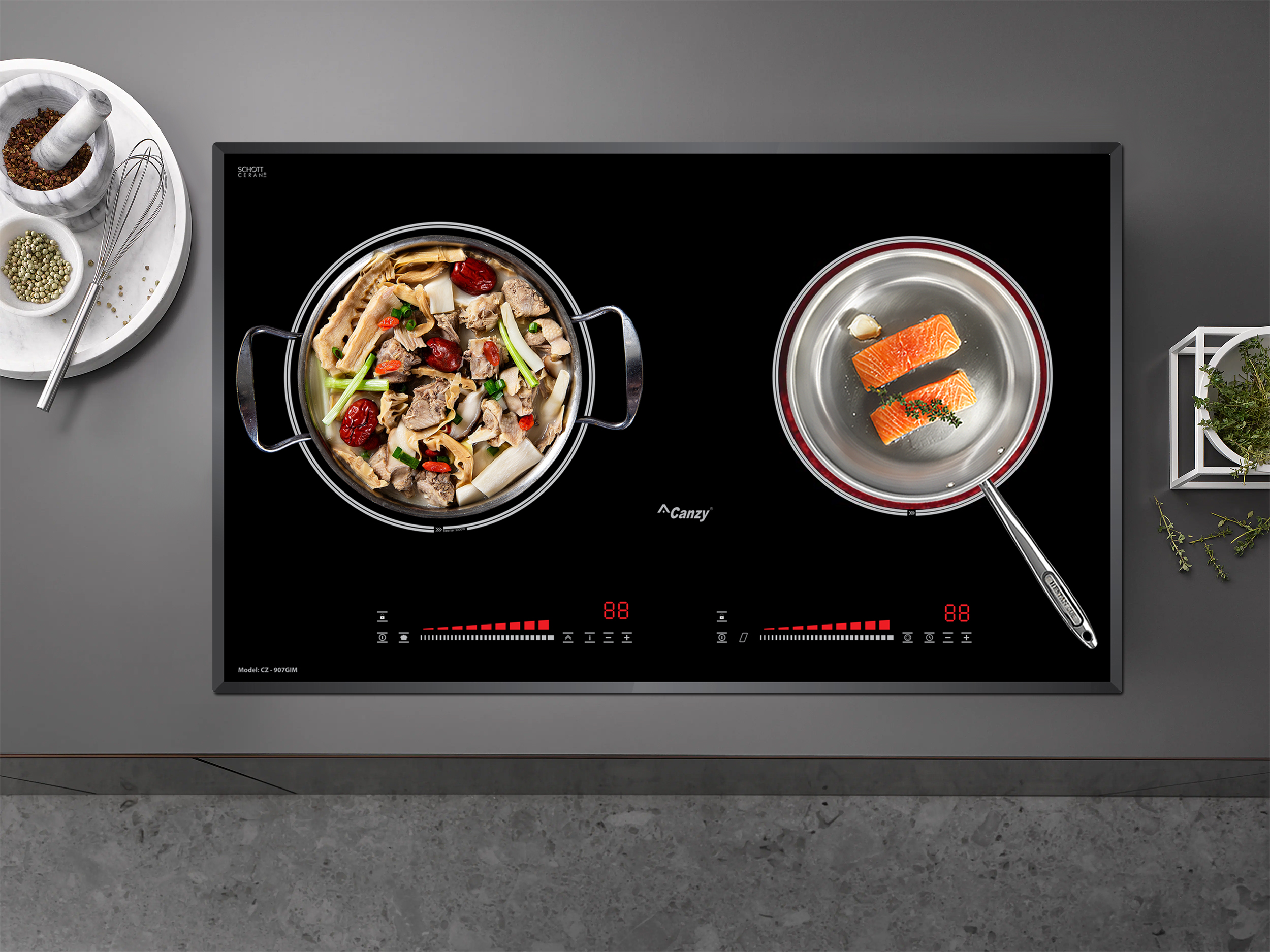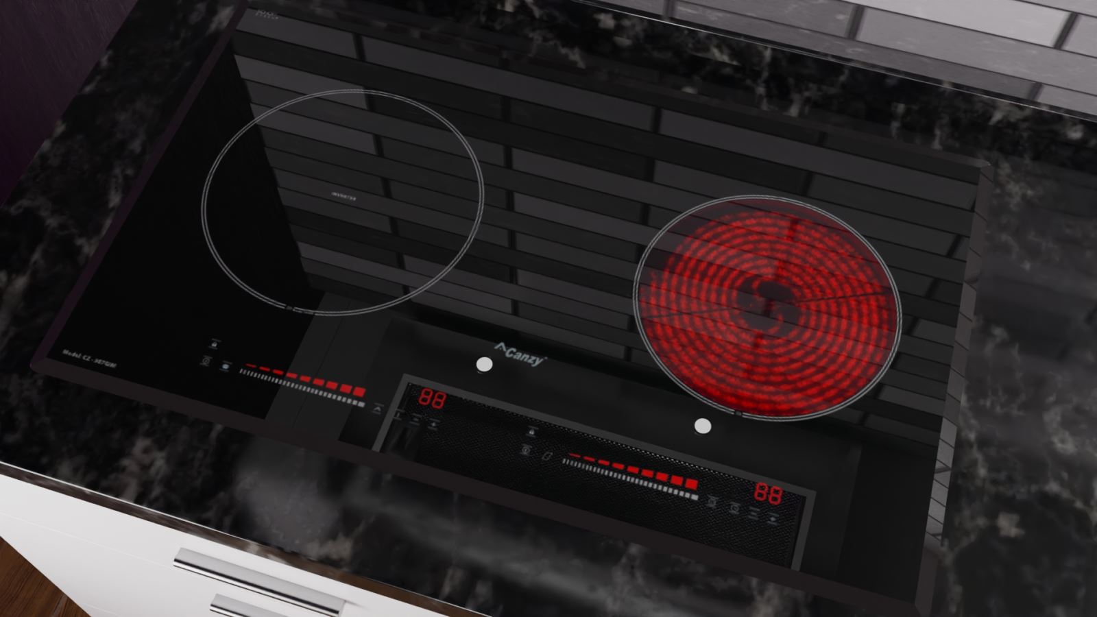 Bếp điện từ Canzy CZ-907GIM gồm 2 vùng nấu với tổng công suất là 5200W. Vùng nấu từ phải với công suất là 2300W khi kích hoạt tính năng nấu siêu nhanh Booster công suất lên tới 3000W. Vùng nấu hồng ngoại trái trang bị mâm nhiệt E.G.O Hi-light 2 vòng nhiệt với công suất tối đa lên tới 2200W. Chức năng Booster nấu siêu nhanh, tuy nhiên thời gian tối đa mặc định dùng chức năng này là 10 phút/lần tránh quá tải.