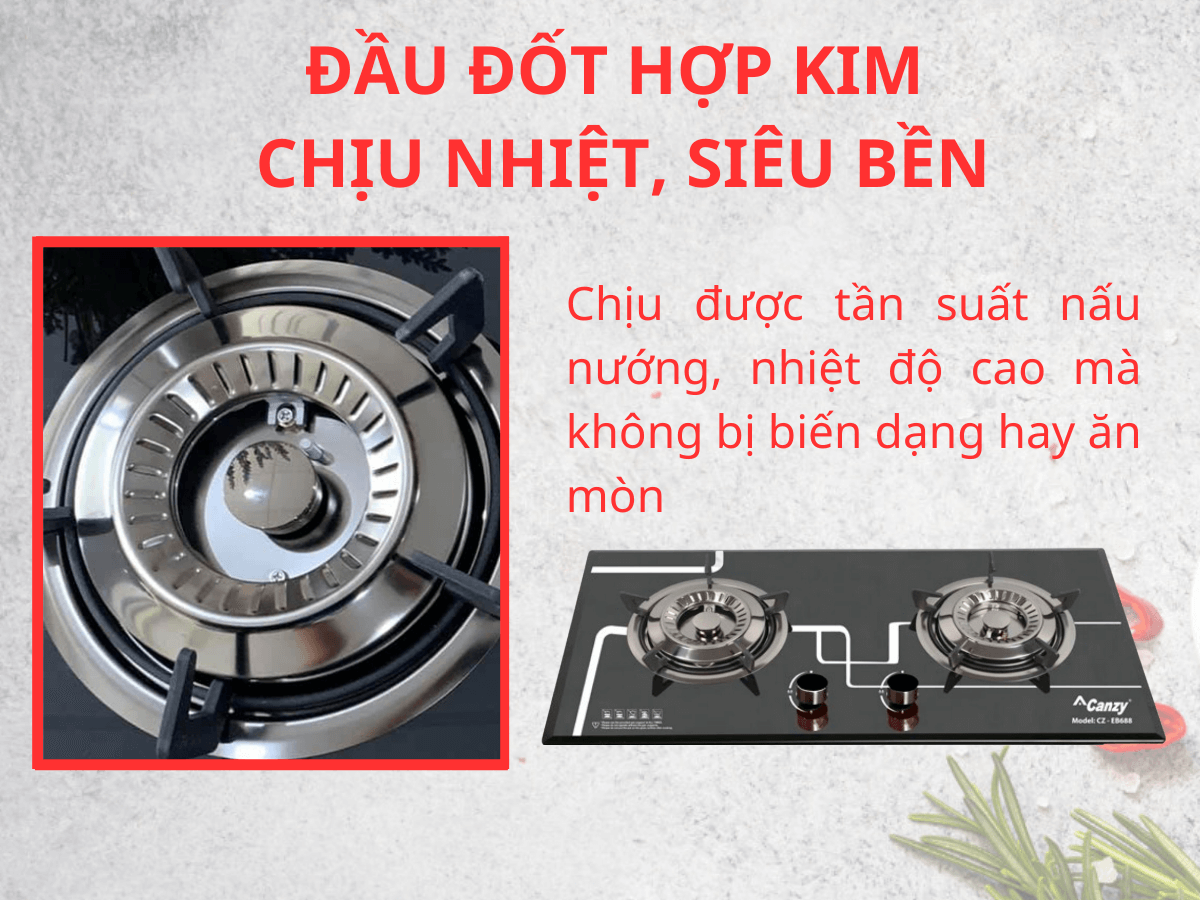 Bếp Gas Canzy CZ EB688 sử dụng đầu đốt bằng chất liệu hợp kim với độ bền cao, không hoen rỉ hay biến dạng sau khoảng thời gian dài sử dụng. Đầu đốt cũng được thiết kế tạo ngọn lửa xanh, không làm đen xoong, nồi.