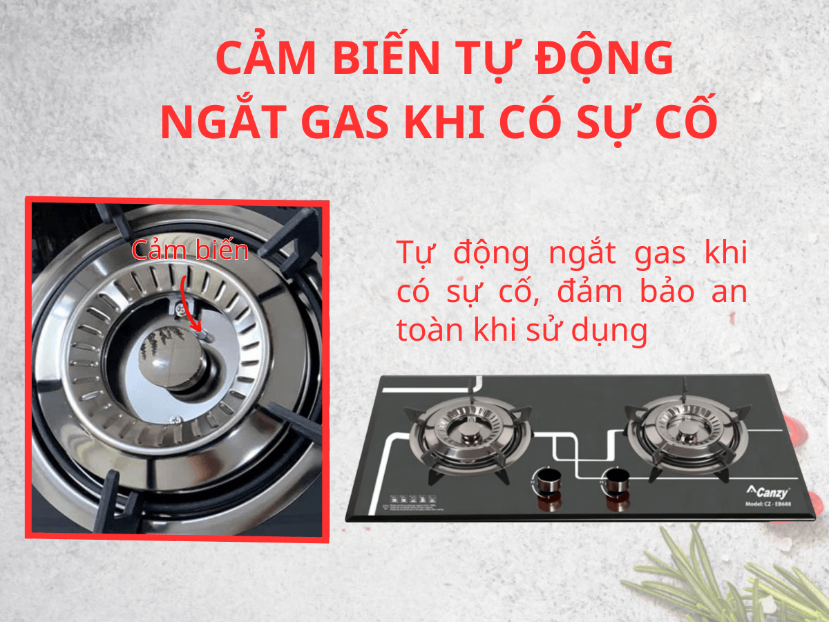 Bếp Gas Canzy CZ EB688 đặc biệt với tính năng ngắt gas tự động an toàn. Khi bếp gặp phải những sự cố bất thường về lửa như có gió lùa mạnh hay nước tràn làm tắt lửa đột ngột, thì bộ phận cảm ứng thông minh của bếp sẽ tự động ngắt gas, tránh nguy cơ cháy nổ hay rò rỉ khí gas, đảm bảo sự an toàn cho bạn và gia đình.