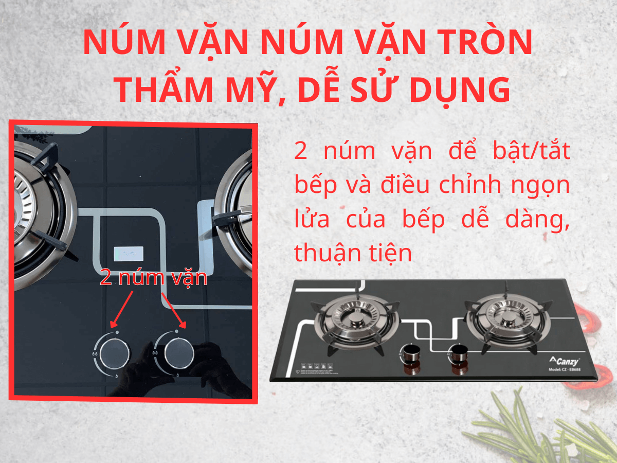 Bếp Gas Canzy CZ EB688 với núm vặn tròn màu đồng làm bằng chất liệu cao cấp, không rỉ sét, nổi bật trên nền kính đen của bếp, làm tăng tính thẩm mỹ cho sản phẩm. Thao tác bật/tắt bếp cũng như điều chỉnh ngọn lửa lớn nhỏ vô cùng đơn giản, chỉ cần xoay nhẹ núm là có thể điều chỉnh cường độ ngọn lửa theo ý muốn.