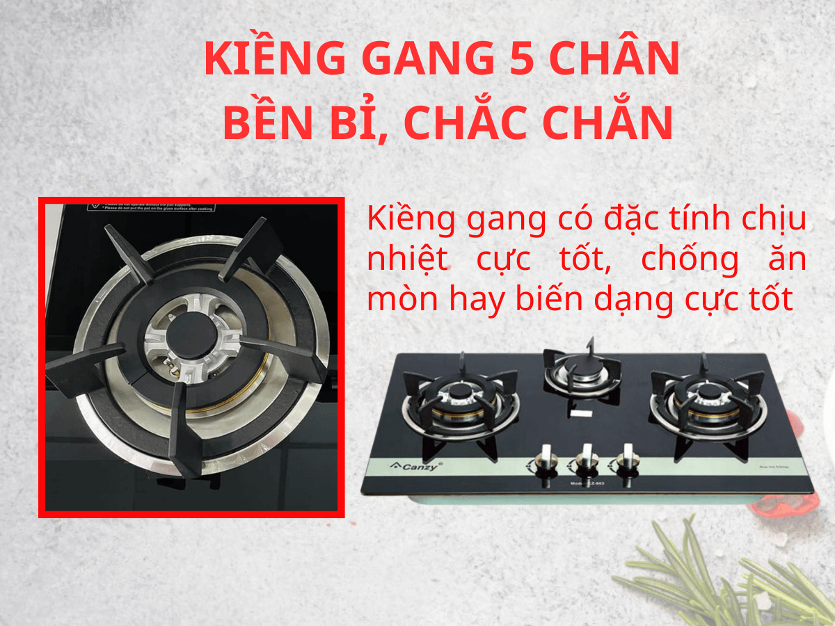 Bếp Gas Canzy CZ EB688 trang bị kiềng bếp với 5 chân vững chắc, cố định mọi loại xoong, nồi. Bạn có thể thoải mái sử dụng nồi với đa dạng kích thước mà không sợ bị nghiêng, lệch hay trượt. Đặc biệt, kiềng bếp được làm từ gang đúc cao cấp siêu bền, chịu nhiệt, chống gỉ, chống mài mòn và có khả năng chịu lực tốt, không lo bị biến dạng, rỉ sét kể cả khi có nước hay thức ăn trào xuống. Khi bám bẩn và cần vệ sinh, chùi rửa, bạn cũng dễ dàng tháo ra nhờ thiết kế kiềng rời.