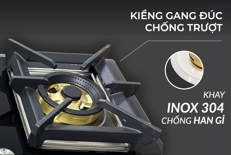 Bếp được sử dụng kiềng gang đúc chống trượt, bề mặt mài mịn được phủ lớp men mờ kiểu dáng vững chắc theo phong cách Châu âu. Khay Inox xước cao cấp chống han gỉ luôn tạo cho bếp được sáng bóng bền vững với thời gian.