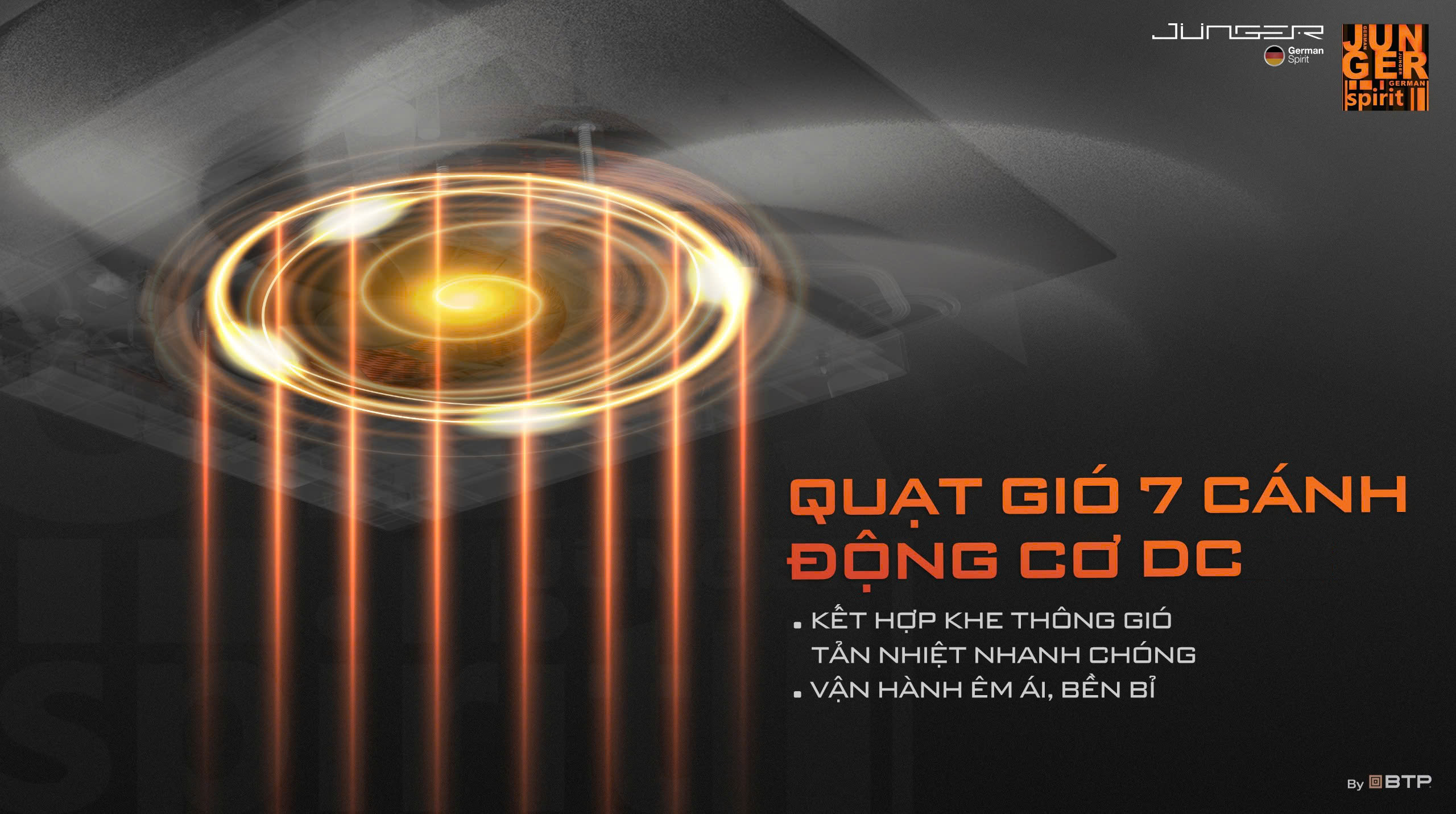 Điểm nổi bật của bếp hồng ngoại đơn Junger IS-19 chính là hệ thống tản nhiệt được trang bị 1 quạt gió sử dụng động cơ DC vận hành êm ái, bền bỉ và tiết kiệm điện năng. Với thiết kế quạt 7 cánh cùng khe thông gió trên khung bếp, hiệu quả tản nhiệt được tối ưu hóa, đảm bảo linh kiện hoạt động ổn định ngay cả trong môi trường nóng ẩm. Nhờ vậy, người dùng hoàn toàn yên tâm tận hưởng quá trình nấu nướng mà không lo bếp bị quá nhiệt hay ảnh hưởng đến tuổi thọ của bếp.