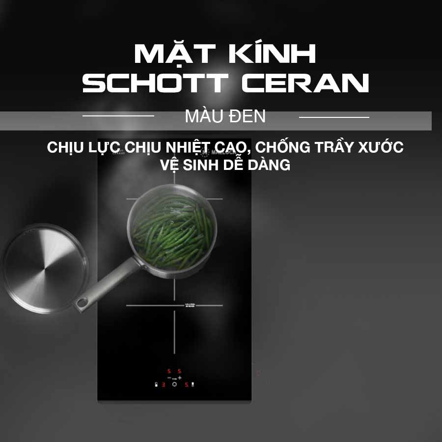 - Mặt kính cao cấp, nhiều tính năng: Bếp điện Domino MDR 302 sỡ hữu mặt kính cao cấp Schott Ceran có xuất xứ từ Đức cao cấp giúp căn bếp trở nên sang trọng và thu hút. Không chỉ mang tính thẩm mĩ cao, mặt kính này còn có khả năng chịu lực, chịu nhiệt lên đến 700 độ C, chống trầy xước và va đập tốt, bền bỉ với thời gian.