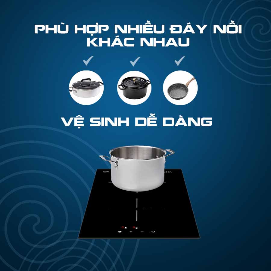 - Hai vùng nấu rộng rãi, không kén nồi: Sản phẩm trang bị với 2 vùng nấu rộng rãi, khoảng cách hợp lý, đảm bảo thực hiện việc nấu cùng lúc 2 bếp dễ dàng và an toàn.