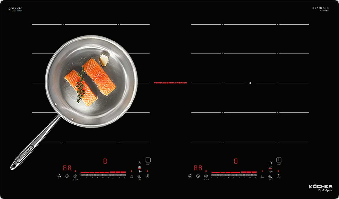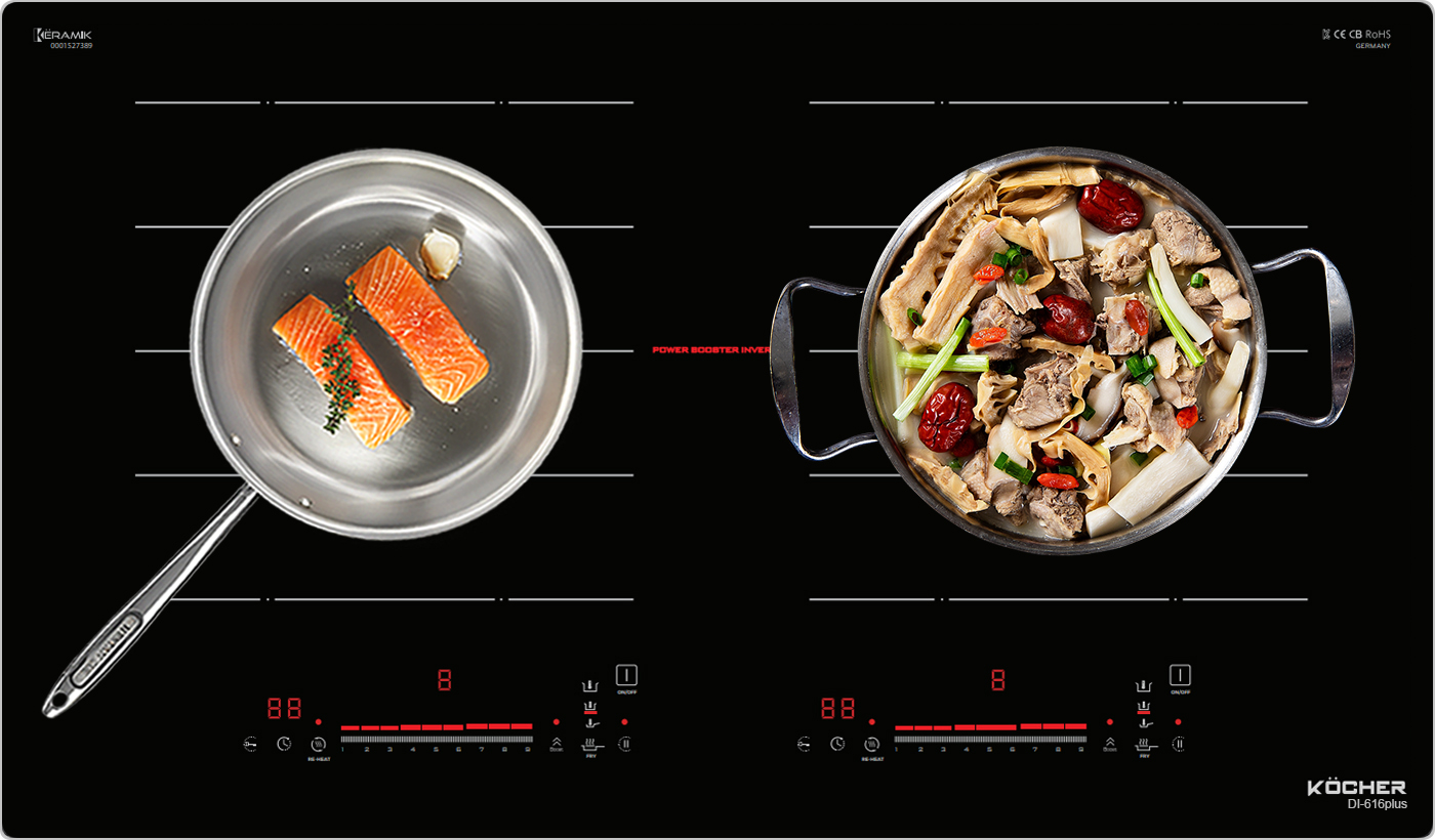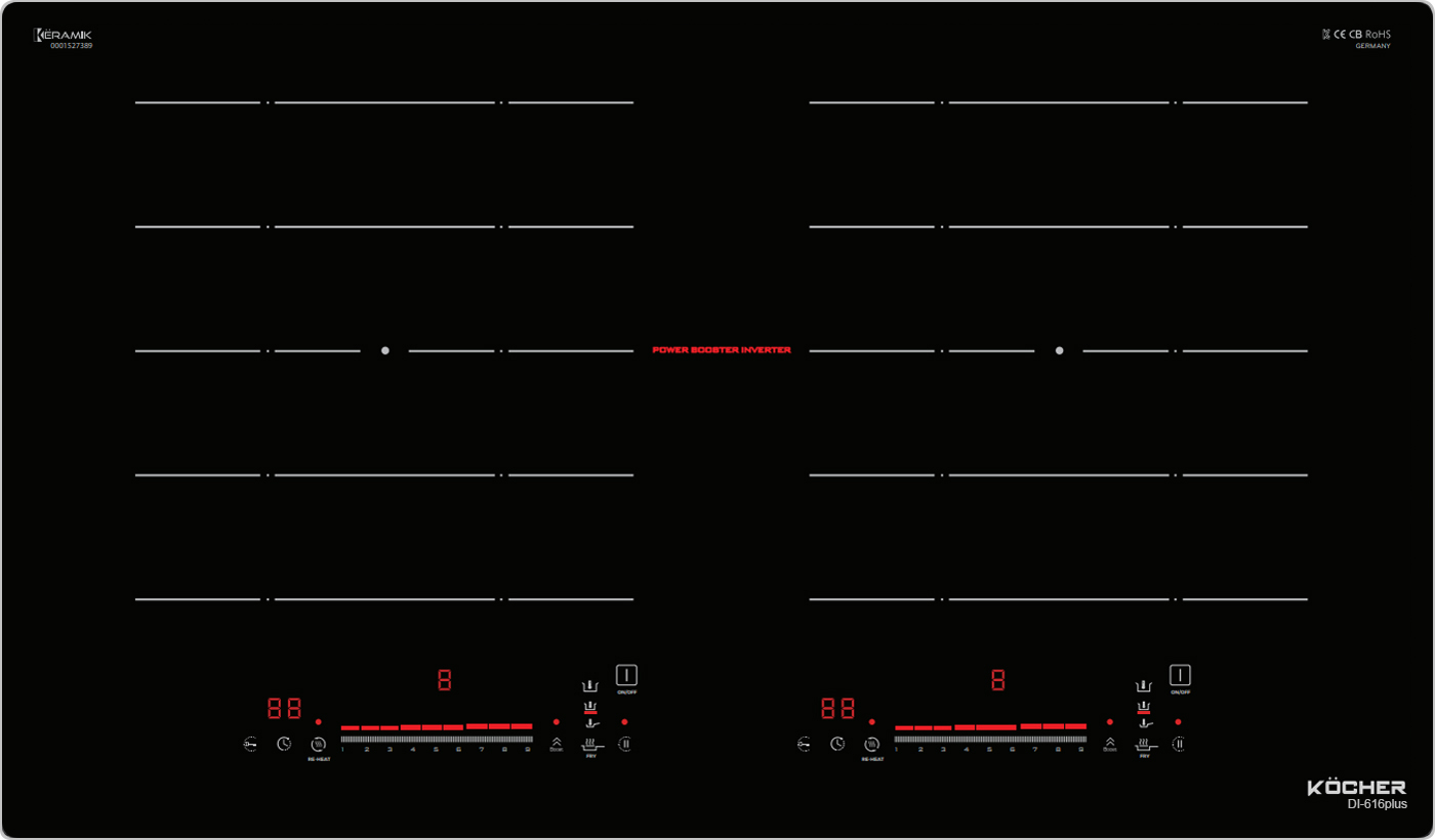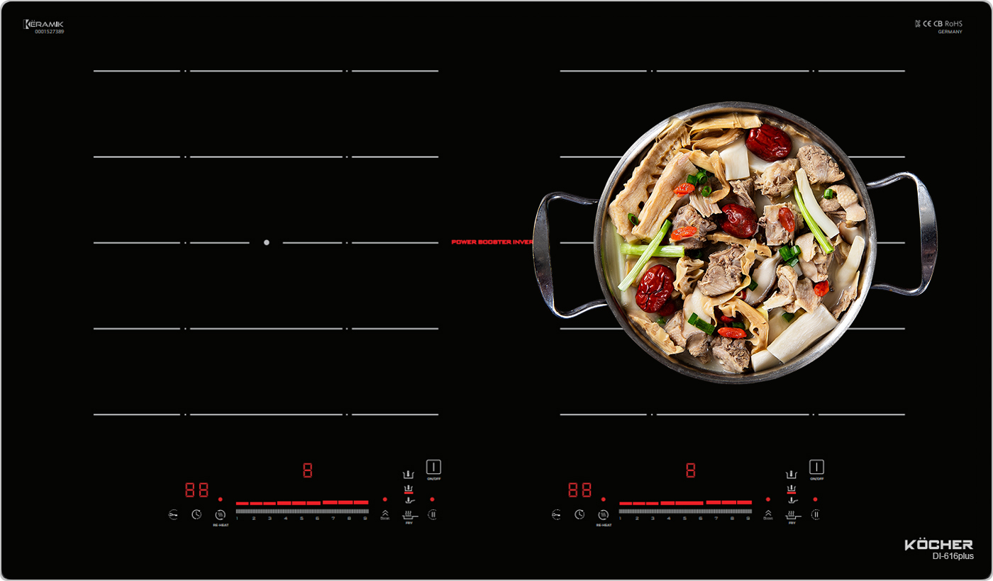 Đây một trong số rất ít bếp từ có thể đạt Booster lên đến 2300W. Với thiết kế của bếp từ Kocher DI-616Plus cả 2 vùng nấu có khả năng kích công suất Booster cực đại lần lượt là 2300W | 2300W giúp công việc đun nấu trở nên nhanh chóng và tiết kiệm thời gian khi cần thiết.