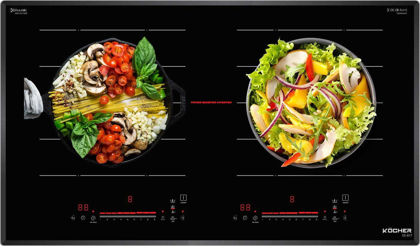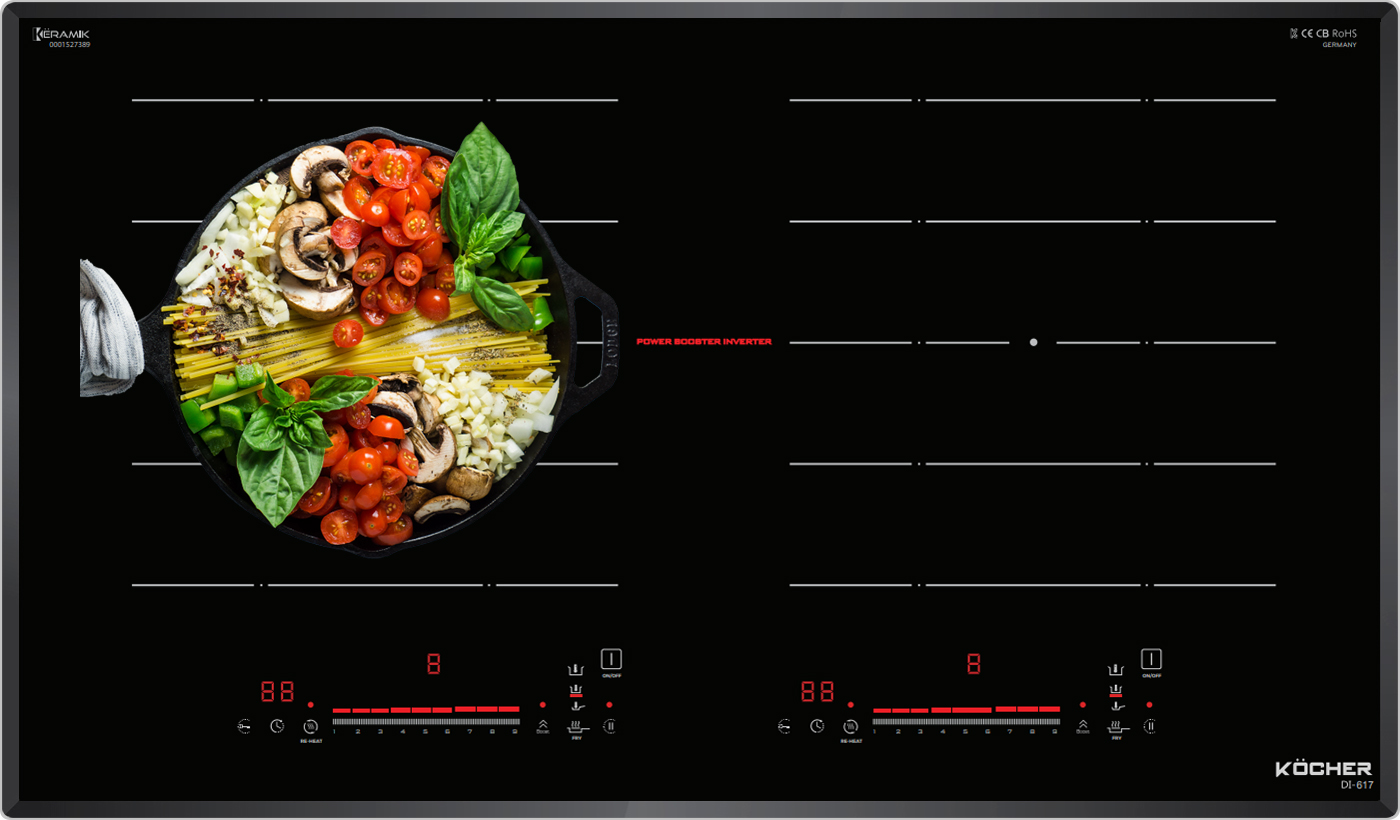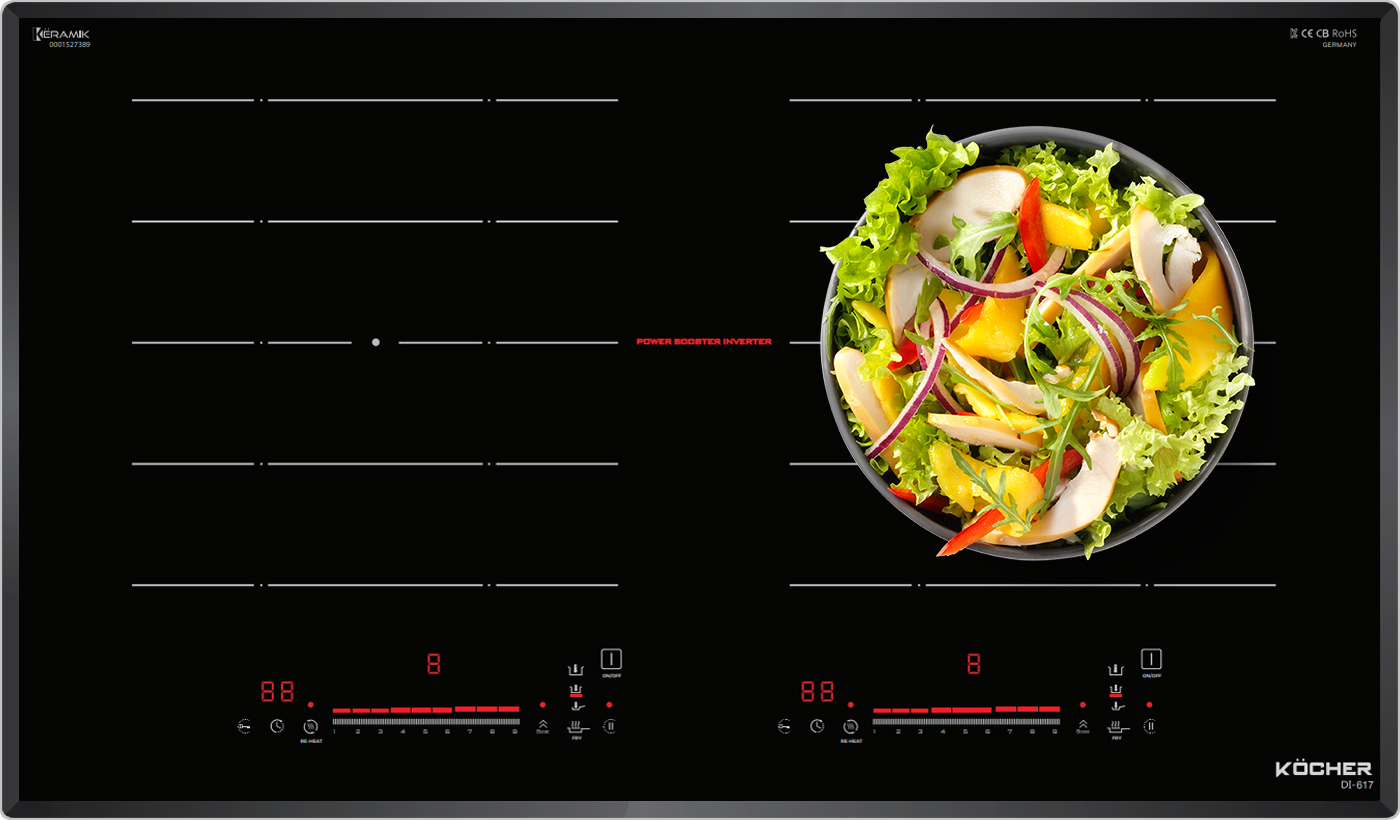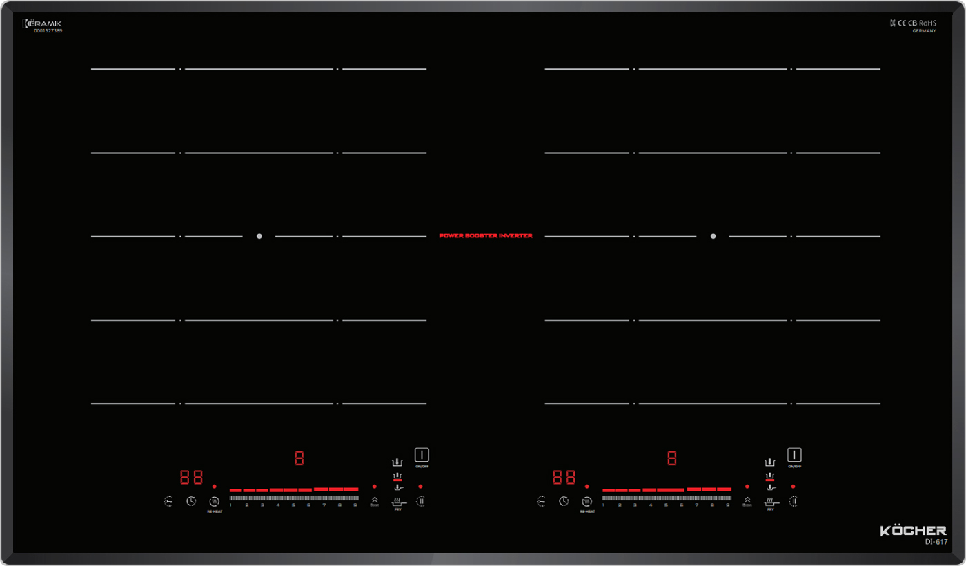 Bếp từ Kocher DI-617 được tích hợp chức năng tự nhận diện vùng nấu, khi ta đặt nồi lên 1 trong 2 vùng nấu sau đó ấn nút khởi động bếp sau thời gian 1-2 giây bếp sẽ tự động tìm vùng nấu đã có nồi, ta chỉ việc điều chỉnh mức công suất to nhỏ theo ý muốn mà không phải thao tác chọn vùng nấu như bếp thông thường. Công nghệ Inverter được áp dụng trên bếp từ Kocher DI-617 có khả năng phản ứng thay đổi công suất theo điều khiển ngay tức thì, khi người dùng điều chỉnh tăng giảm nhiệt độ đun nấu, bếp điều chỉnh thay đổi tức thì về mức nhiệt độ mong muốn.