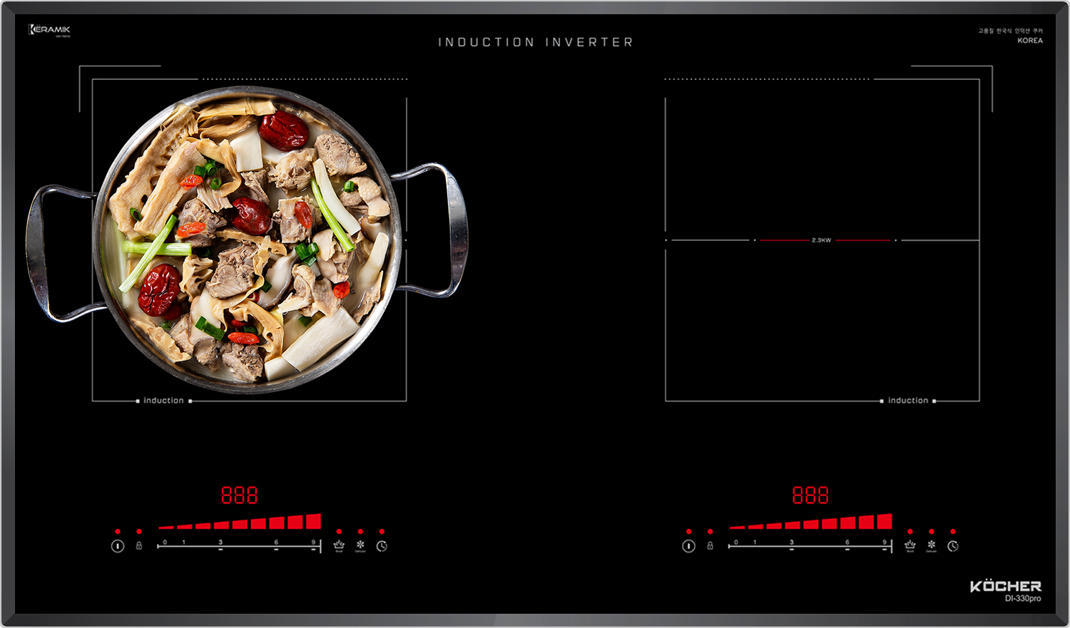 Đây một trong số rất ít bếp từ có thể đạt Booster lên đến 2300W. Với thiết kế của bếp từ Kocher DI-330Pro cả 2 vùng nấu có khả năng kích công suất Booster cực đại lần lượt là 2300W | 2300W giúp công việc đun nấu trở nên nhanh chóng và tiết kiệm thời gian khi cần thiết.