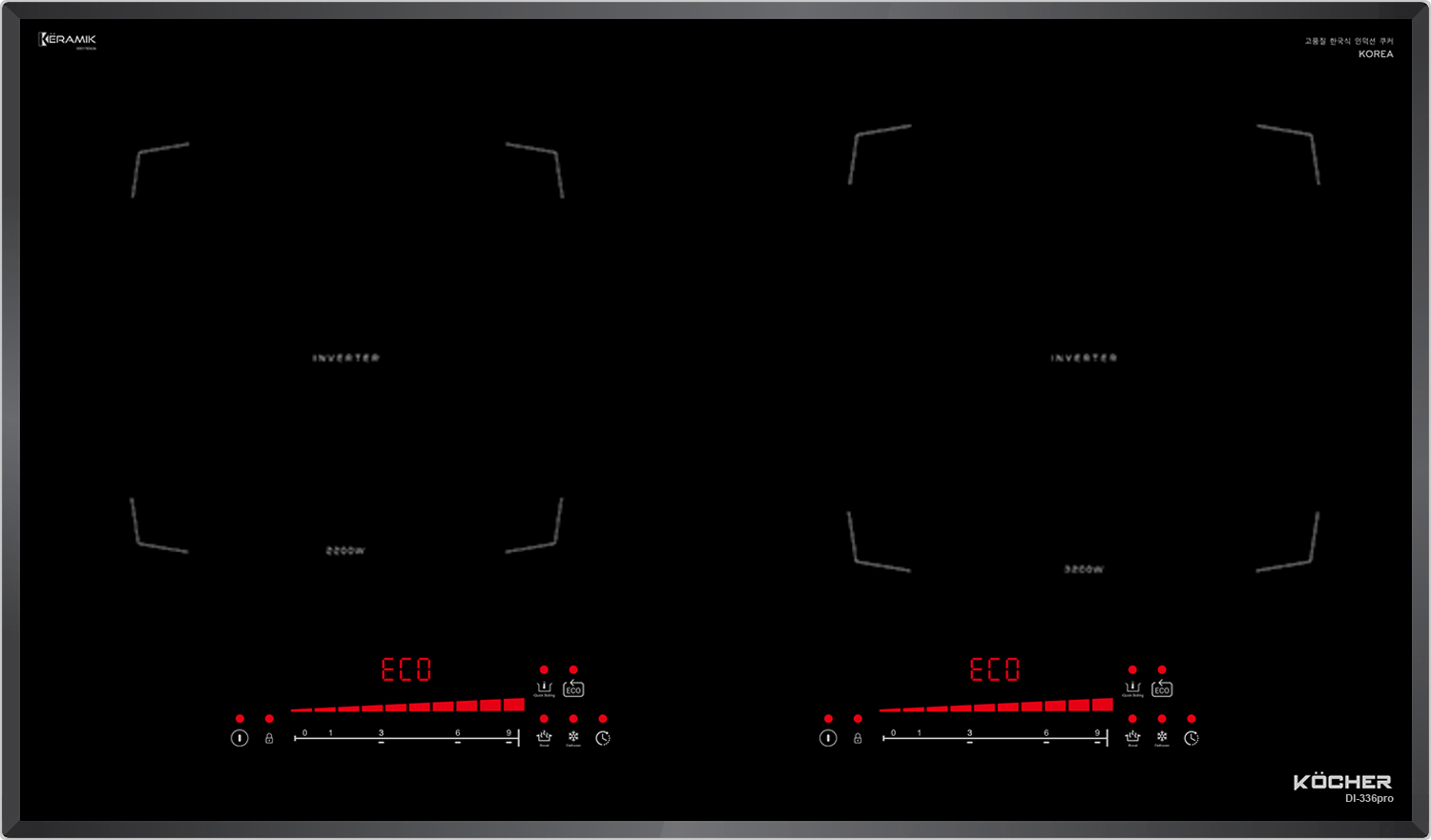 Đây một trong số rất ít bếp từ có thể đạt Booster lên đến 3200W. Với thiết kế của bếp từ Kocher DI-336Pro cả 2 vùng nấu có khả năng kích công suất Booster cực đại lần lượt là 2200W | 3200W giúp công việc đun nấu trở nên nhanh chóng và tiết kiệm thời gian khi cần thiết.