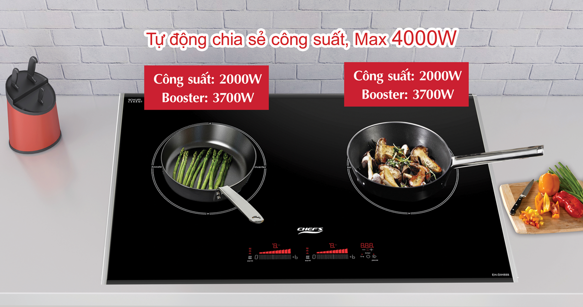 Bếp từ Inverter Chefs EH-DIH888 có tính năng tự động chia sẻ công suất, tối đa 4000W. Khi sử dụng đồng thời 2 vùng nấu, nếu tổng công suất đang đạt 4000W, khi một vùng nấu tăng công suất thì vùng nấu còn lại sẽ tự động giảm để đảm bảo duy trì ở mức công suất tối đa. Điều này giúp bảo vệ nguồn điện, bảo vệ bếp và tăng tuổi thọ cho bếp.