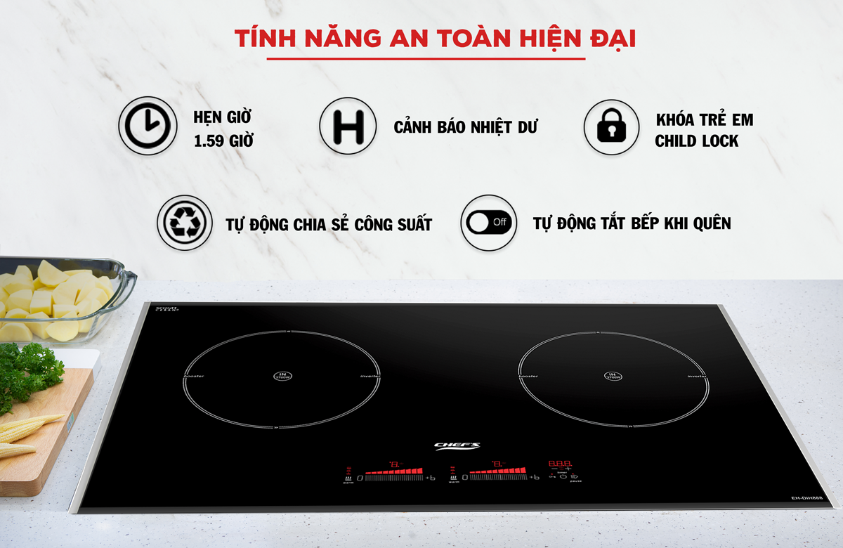 Cảnh báo nhiệt dư: Sau khi sử dụng, nếu vùng nấu mặt bếp còn nóng, màn hình LED sẽ hiển thị chữ H để cảnh báo để người dùng không chạm tay vào mặt bếp gây bỏng.