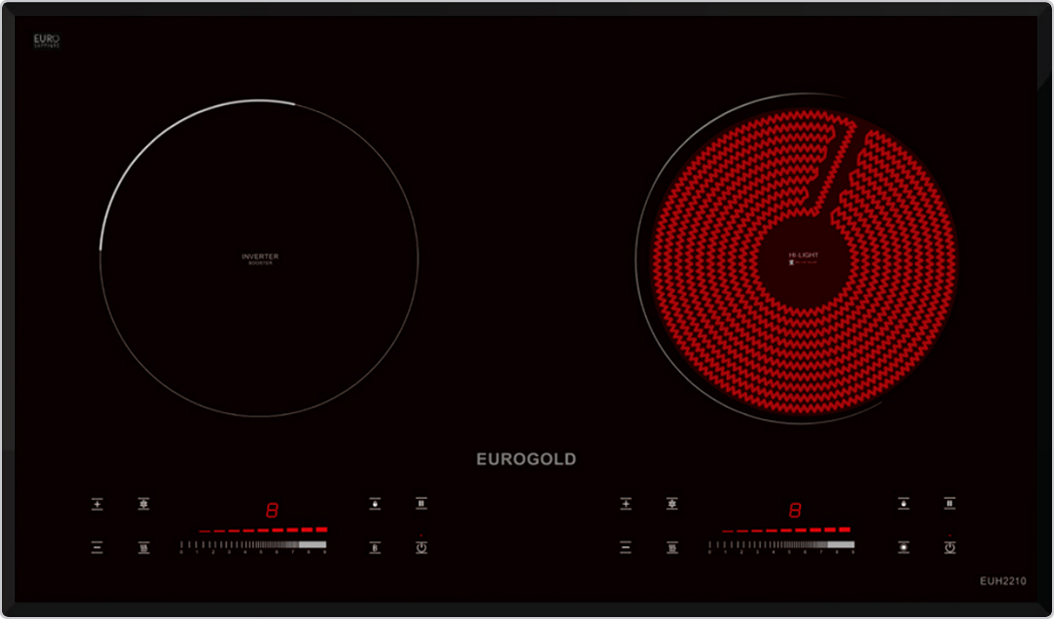 Bếp điện từ Eurogold EUH2210 gồm 2 vùng nấu với tổng công suất 3700W. Vùng nấu từ trái có công suất 2300W khi kích hoạt tính năng nấu nhanh Booster công suất lên tới 3000W. Vùng nấu hồng ngoại sử dụng mâm nhiệt Hi-light với 02 vòng nhiệt có công suất 2300W.