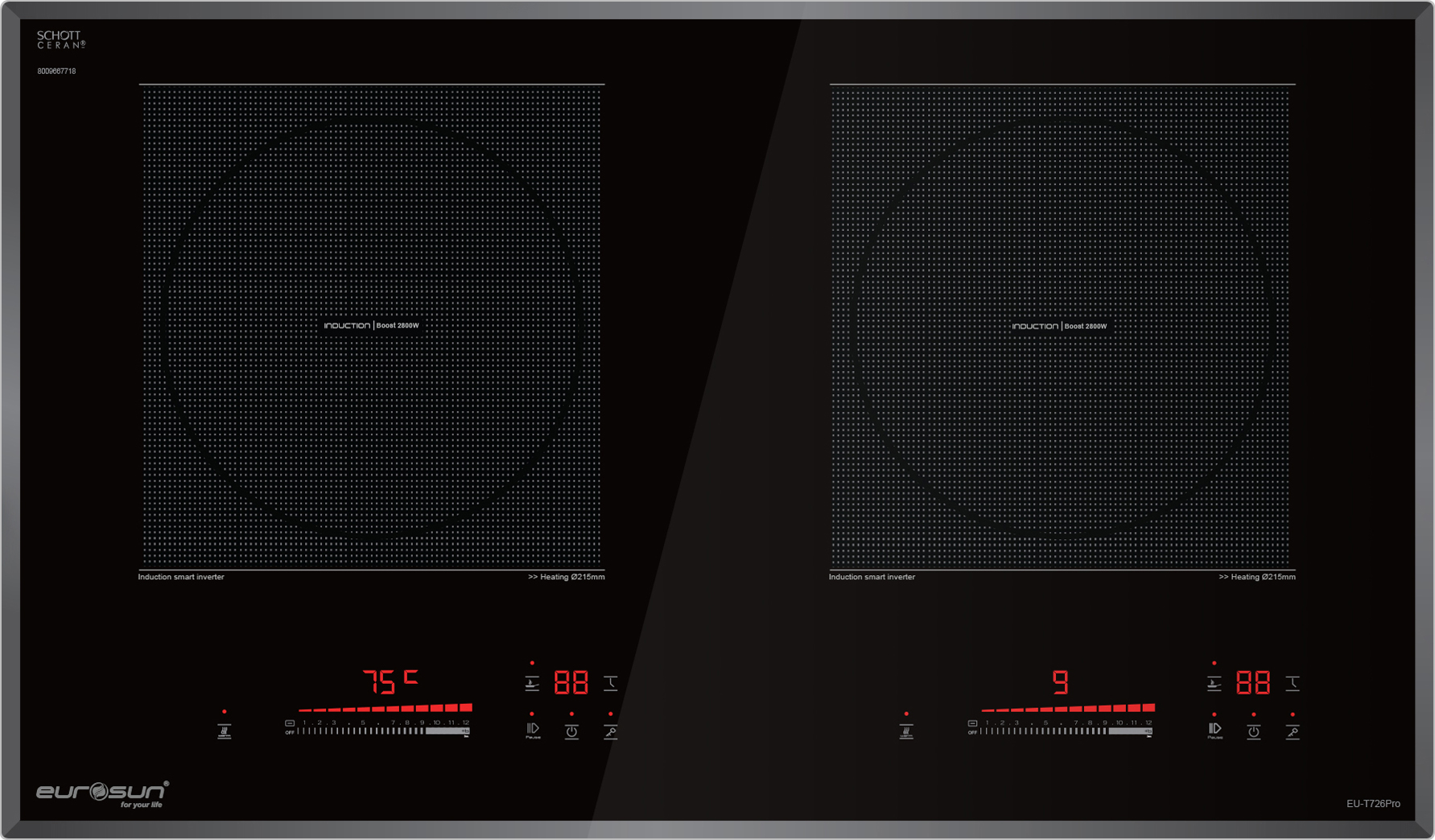 EU-T726Pro vẫn sử dụng mặt kính Schott Ceran giống như những mẫu bếp từ cao cấp nhập khẩu từ Đức khác. Tương tự như Cata, các sản phẩm dòng bếp cao cấp của Eurosun đều có mã số riêng trên mặt kính sau chương trình ký kết hợp tác với công ty Schott Ceran | Đức.