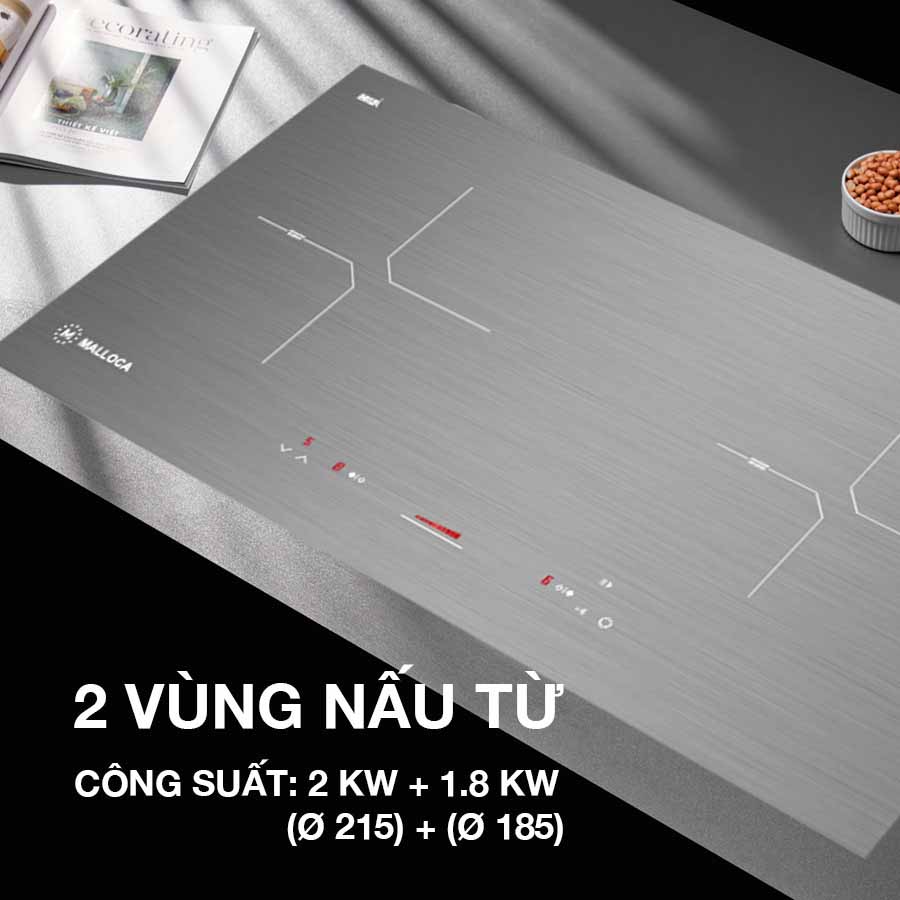 - Thiết kế 2 vùng nấu riêng biệt: Có tới 2 vùng nấu, bếp từ Malloca Mh-02IS giúp bạn tận dụng không gian bếp để nấu nhiều món cùng lúc. Khoảng cách 2 vùng nấu rộng rãi đảm bảo an toàn, tránh bị phỏng khi bạn nấu ăn trên bếp……