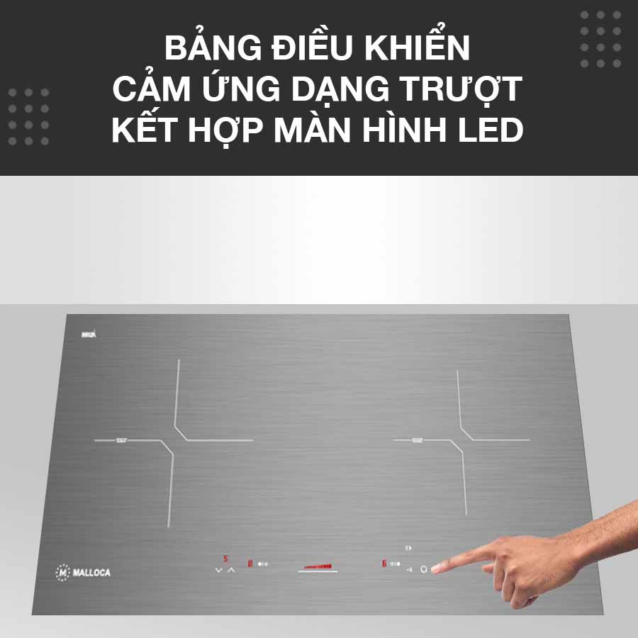 - Bảng điều khiển cực đơn giản, dễ sử dụng: Bảng điều khiển của bếp từ đôi Malloca MH-02IS rất dễ nhìn và dễ thao tác, có đầy đủ các kí hiệu nút nguồn, khóa bảng điều khiển, tạm dừng, chọn vùng nấu, tăng giảm công suất,…Việc thiết kế rõ ràng như thế giúp cho việc sử dụng bếp được dễ dàng hơn, đặc biệt các gia đình có người lớn tuổi cần sử dụng bếp trong việc nấu ăn hàng ngày.