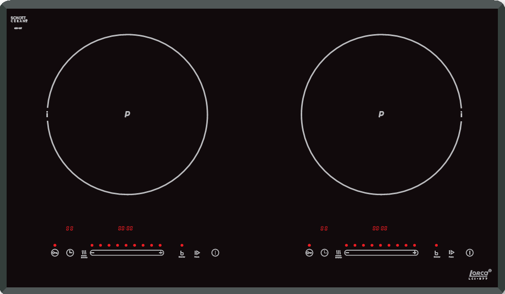 Bếp từ Lorca LCI 877 được sản xuất trên dây chuyền hiện đại của Châu Âu và được lắp ráp tại malaysia nên bếp có giá thành khá phù hợp với người tiêu dùng, bếp sử dụng hoàn toàn linh kiện cao cấp của Đức như mặt bếp được làm bằng loại kính Schott Ceran cao cấp, nhập khẩu trực tiếp từ Đức sở hữu tính chịu lực, chịu nhiệt cực tốt, có thể chống lại những cú sốc nhiệt lên tới 750 độ C. Đặc biệt, bề mặt của loại kính này có tráng lớp men đặc biệt, tạo độ bóng, sáng cho mặt bếp, chống trầy xước và chống bám hiệu quả, bạn có thể dễ dàng vệ sinh sau khi đun nấu một cách nhanh chóng. Kết hợp với thiết kế vát cả 4 cạnh, bo trò 4 góc, kính Schott Ceran mang đến cho chiếc Bếp từ Lorca LCI 877 vẻ đẹp sang trọng, tinh tế và chắc chắn.