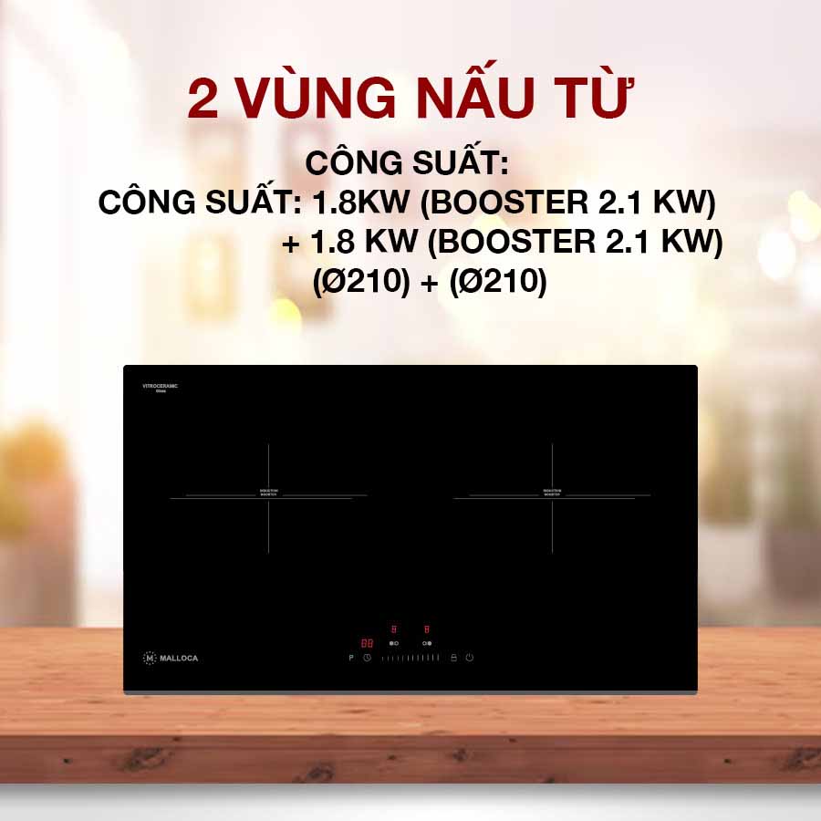 - Thiết kế 2 vùng nấu tối ưu – Bếp Malloca MH-732IN thiết kế với 2 vùng từ, đem đến sự thuận tiện trong quá trình sử dụng. Bạn có thể cùng lúc sử dụng 2 vùng nấu để nấu các món ăn trong gia đình mình, đồng thời sử dụng chức năng Booster nấu nhanh để tiết kiệm thời gian hơn.