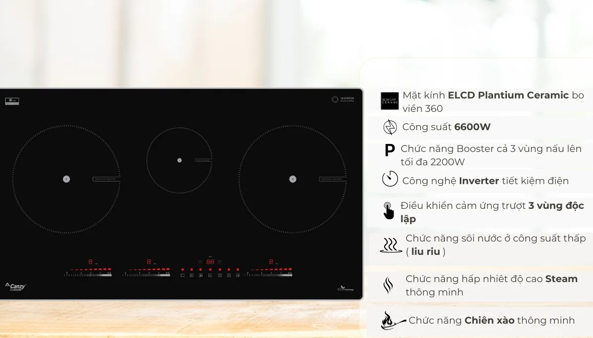 Đây một trong số không nhiều bếp từ có thể đạt Booster lên đến 2200W. Với thiết kế của bếp từ CZ-856HN cả 3 vùng nấu có khả năng kích công suất Booster cực đại lần lượt là 2200W | 1600W | 2200W giúp công việc đun nấu trở nên nhanh chóng và tiết kiệm thời gian khi cần thiết.