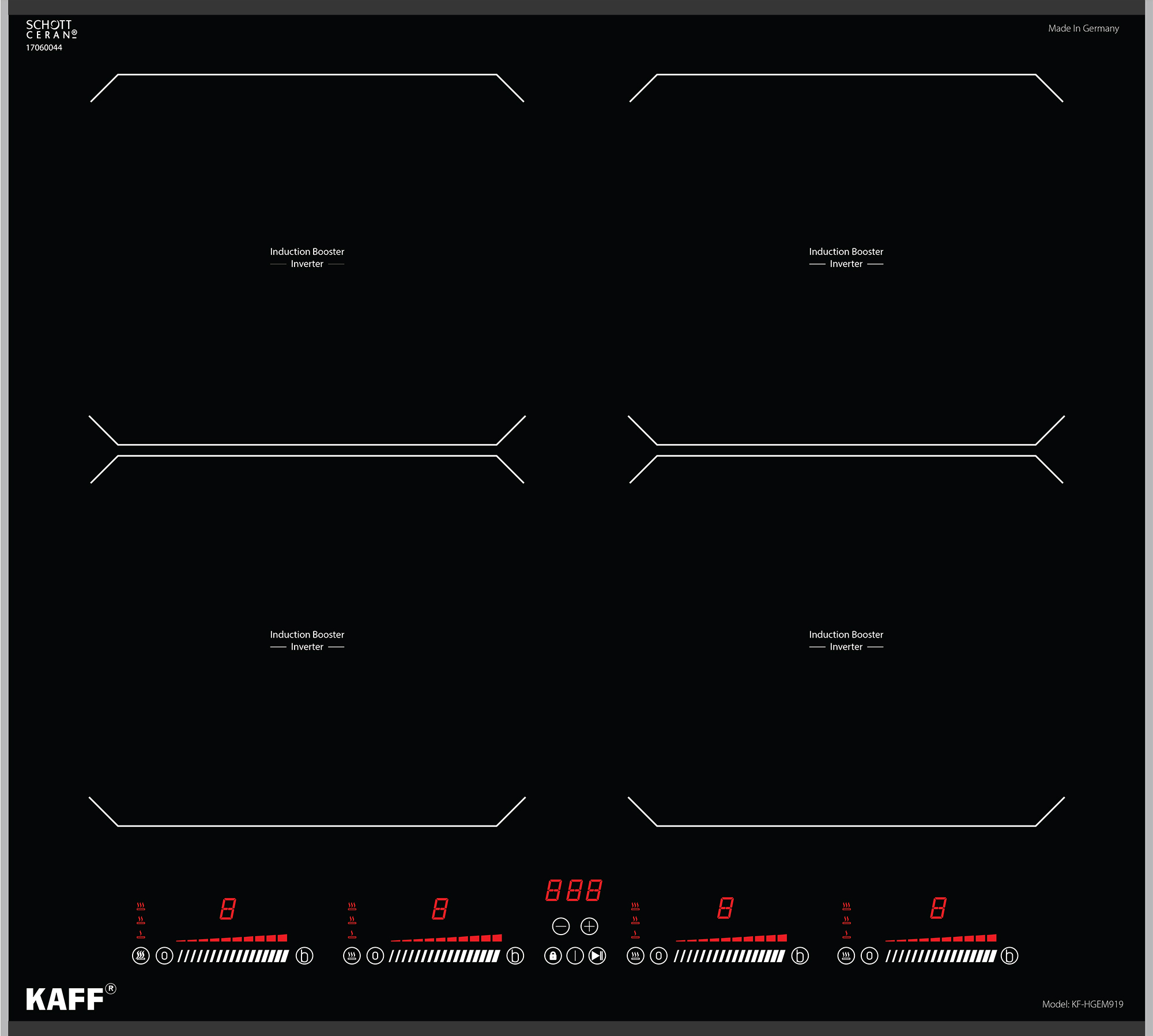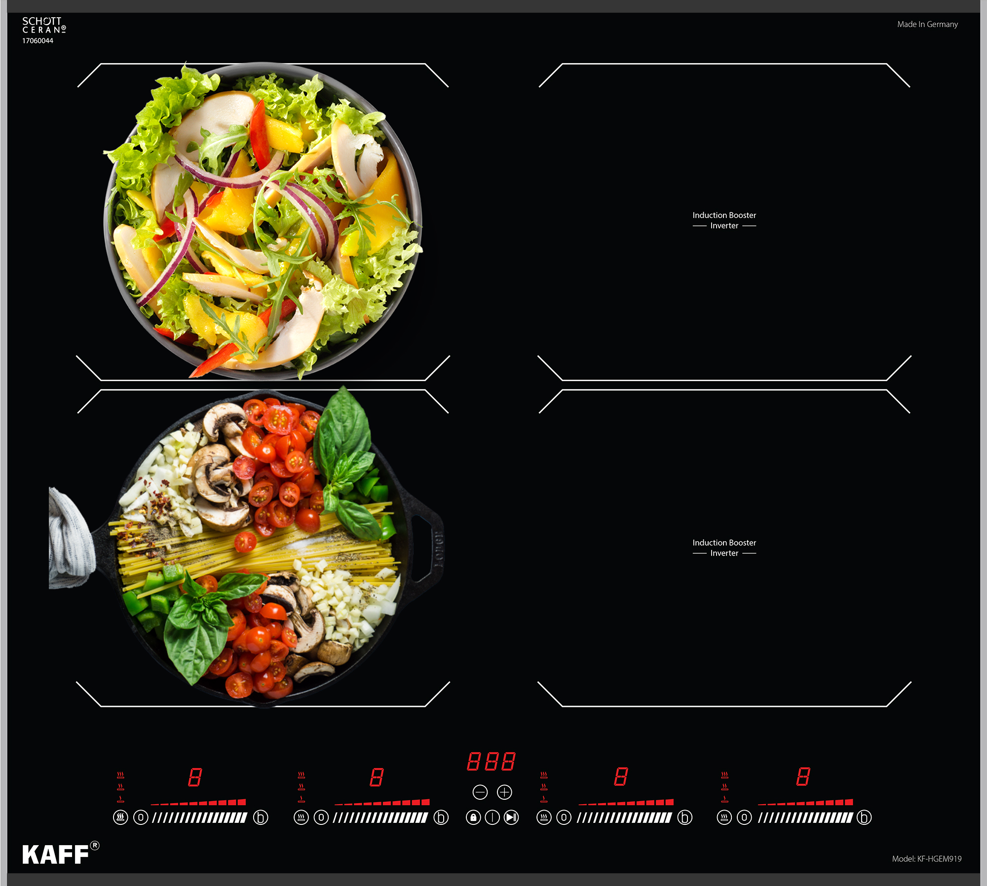 Bếp từ Kaff KF-HGEM919 gồm 4 vùng nấu đáp ứng tối đa nhu cầu sử dụng trong không gian bếp gia đình.