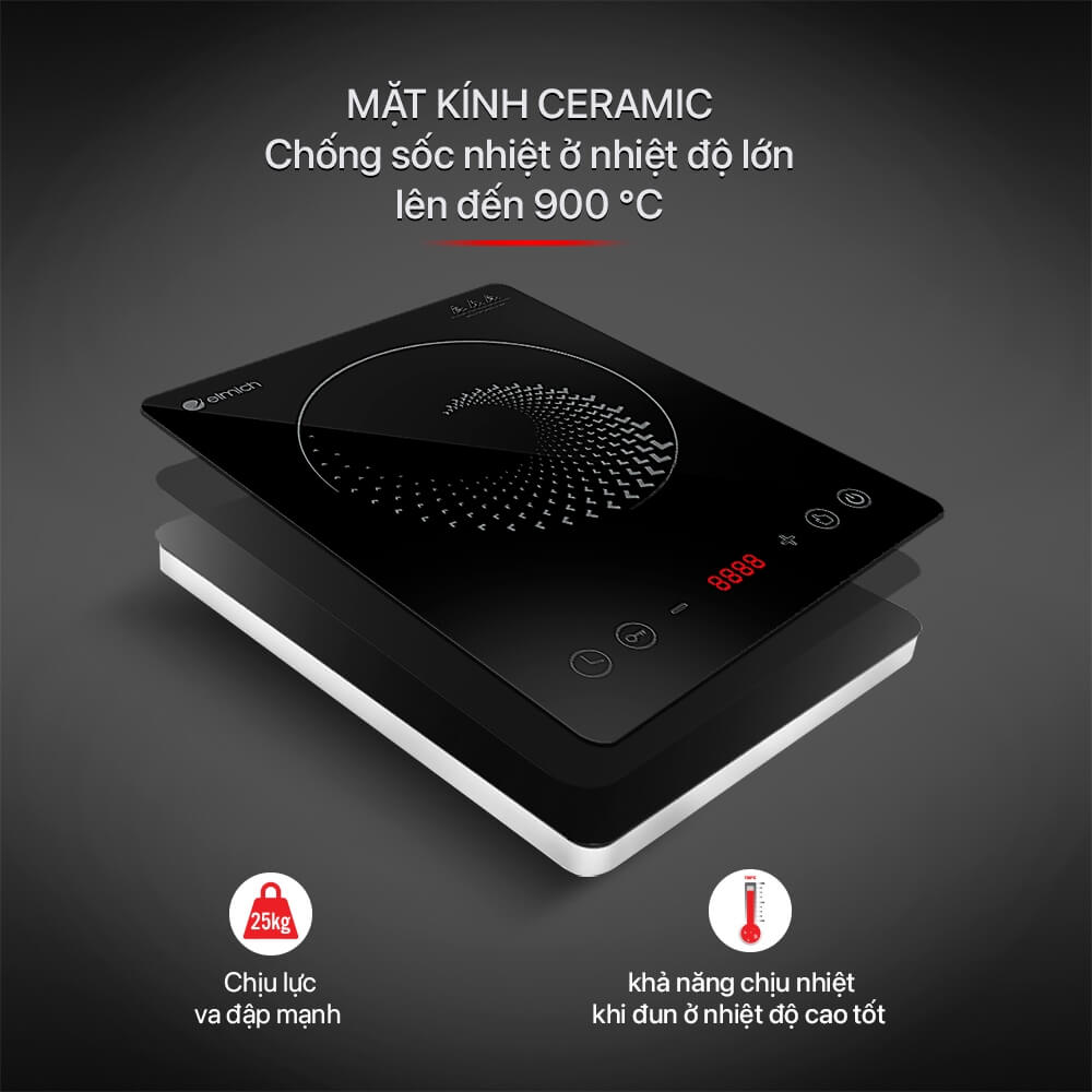 – Mặt bếp bằng kính Ceramic – Trung Quốc sang trọng, chống sốc nhiệt đến 900°C, chịu được lực va đập mạnh, sử dụng bền lâu, dễ dàng vệ sinh.