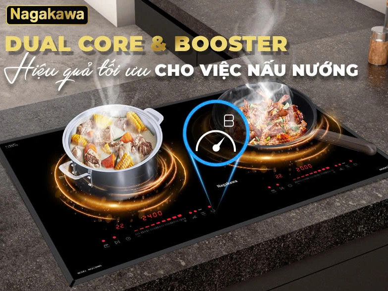 Khi lựa chọn chức năng Booster, công suất bếp đôi điện từ NK2C09MS sẽ nhanh chóng được đẩy lên mức cực đại trong thời gian ngắn và hoạt động liên tục trong thời gian 5 phút, giúp rút ngắn tối đa thời gian đun nấu. Cụ thể, công suất bếp mặc định ở mức 1 là 400W, nếu chọn chức năng Booster, bếp nhanh chóng đạt công suất cực đại từ 2400W.