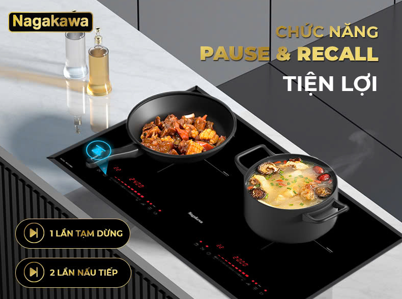 Chức năng Pause & Recall trên bếp đôi điện từ Nagakawa NK2C09MS là một tính năng tiện lợi giúp bạn tạm dừng và ghi nhớ chương trình nấu nướng đang hoạt động, cho phép bạn dễ dàng quay lại nấu nướng mà không cần cài đặt lại từ đầu.