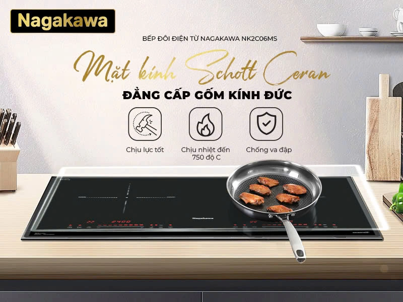 Thiết kế hiện đại, sang trọngBếp từ đôi Nagakawa NK2C06MS được thiết kế theo phong cách hiện đại, họa tiết đơn giản, đẹp mắt. Mặt kính nguyên khối vát cạnh làm tăng vẻ sang trọng cho gian bếp khi lắp âm. Đồng thời, giúp tiết kiệm không gian, tạo cảm giác thoáng và rộng rãi hơn cho căn bếp của bạn. Mặt kính cao cấp Schott Ceran – Đức