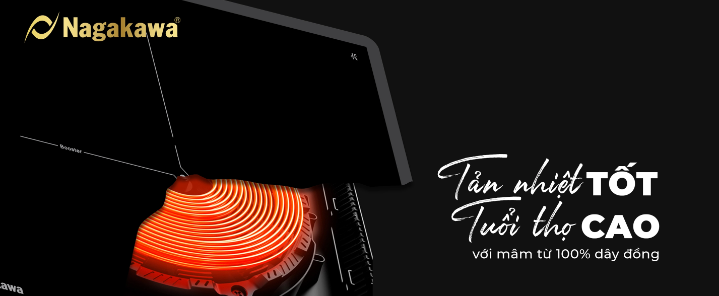 Mâm từ cấu tạo bằng chất liệu đồng dạng cáp (105-160 sợi) dẫn nhiệt nhanh, tản nhiệt tốt giúp bếp hoạt động bền bỉ, tuổi thọ cao.