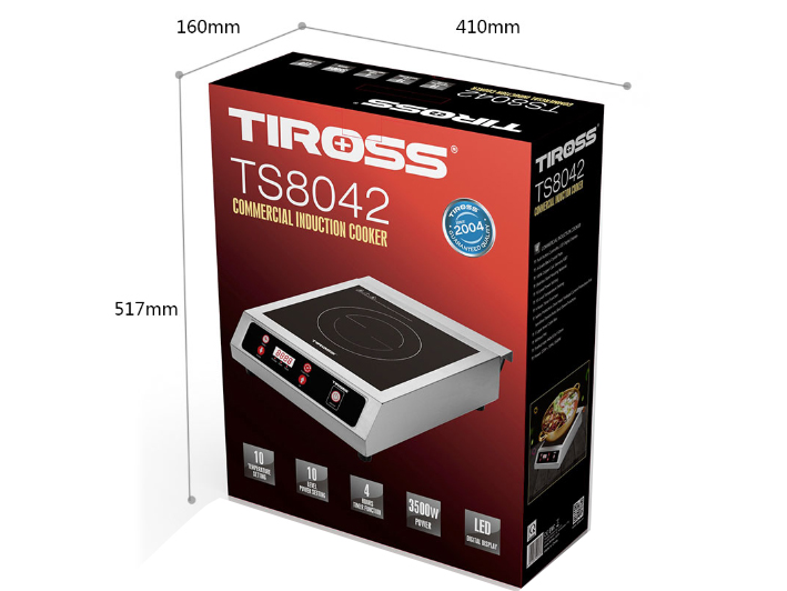 Bếp từ công nghiệp đơn Tiross TS8042 thiết kế với 2 vòng nhiệt sẽ đun nấu được nồi, chảo có đường kính lớn từ 18cm – 35cm (kiến nghị dùng đế bằng trên 25cm).