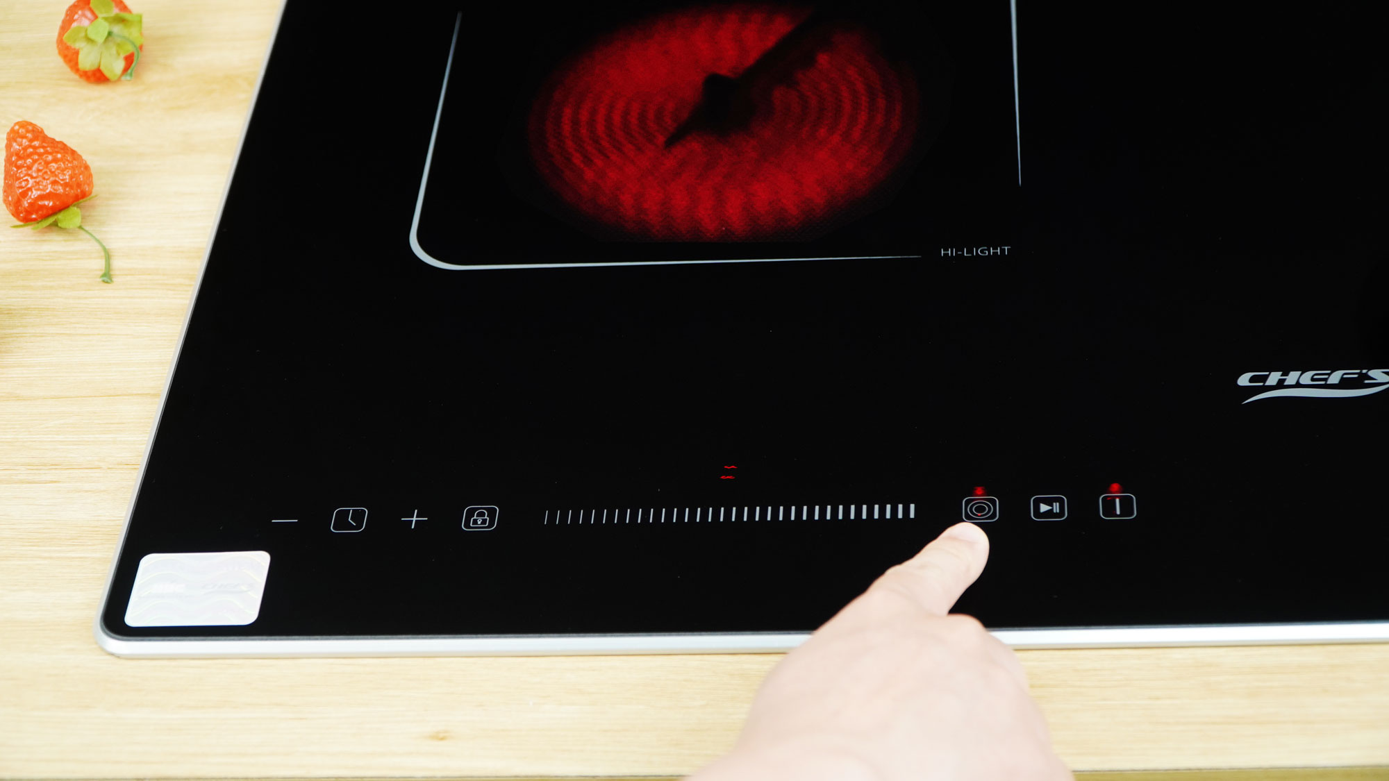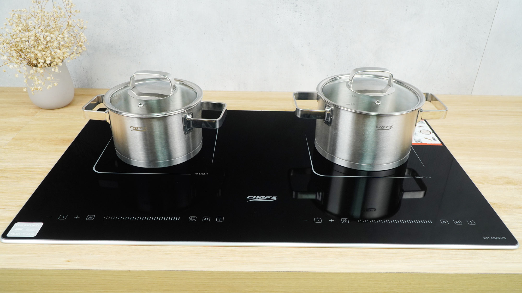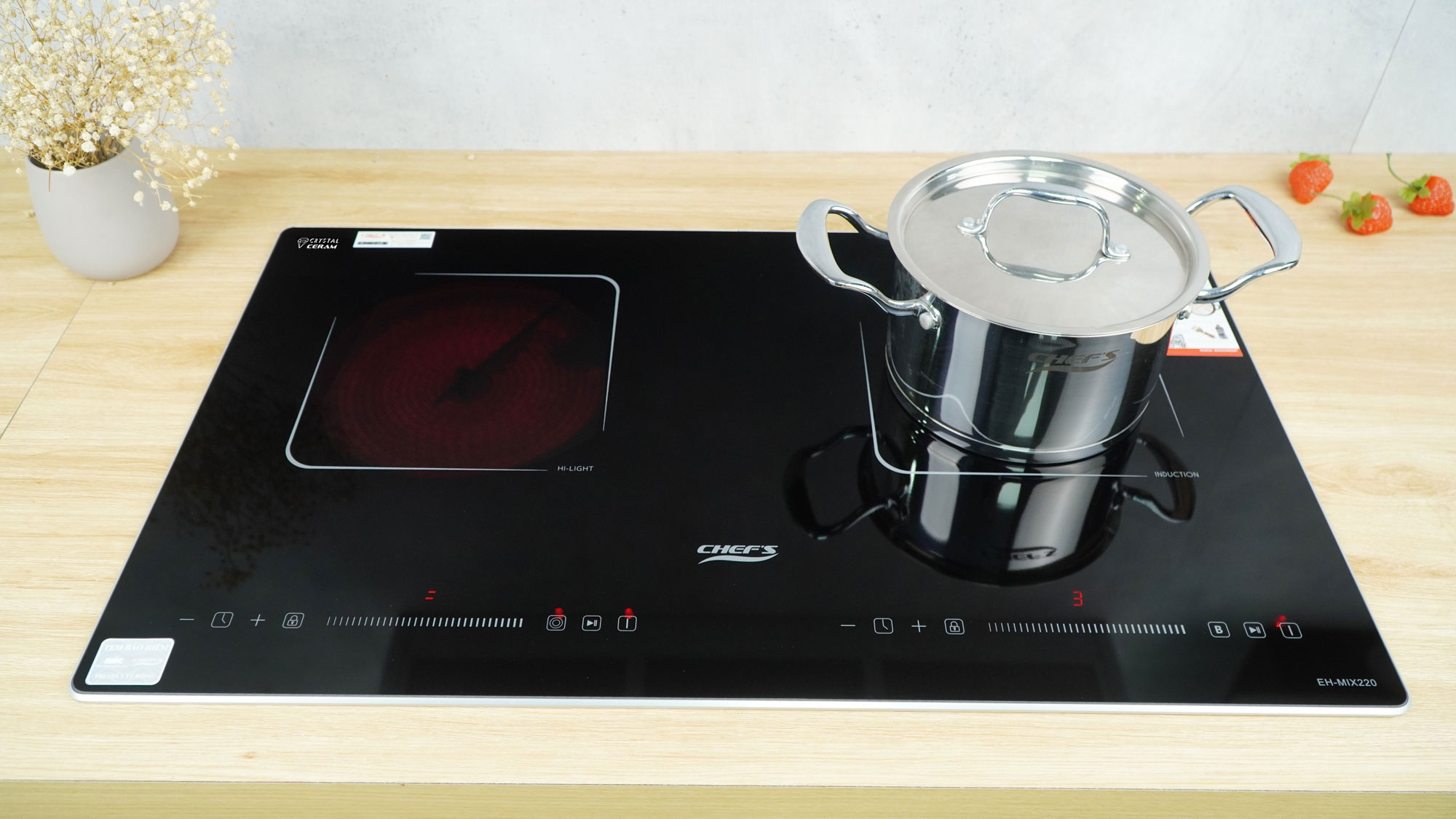 Bếp điện từ Chefs EH-MIX220 gồm 2 vùng nấu với tổng công suất là 4400W. Vùng nấu hồng ngoại trái trang bị mâm nhiệt E.G.O HI-LIGHT với 02 vòng nhiệt có công suất tối đa là 2200W. Vùng nấu từ phải công suất là 2000W có thể đạt mức công suất tối đa khi kích hoạt tính năng nấu nhanh Booster là 2200W. Chức năng Booster ở vùng từ nấu siêu nhanh, tuy nhiên thời gian tối đa mặc định dùng chức năng này là 10 phút/lần tránh quá tải.