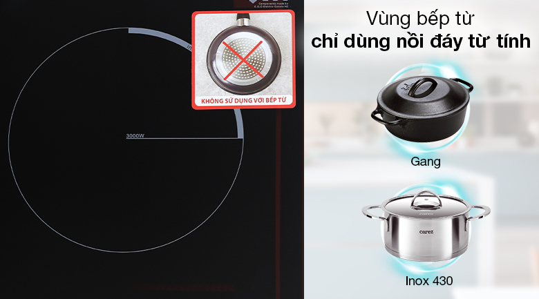 Vùng nấu từ chỉ sử dụng nồi/chảo có đáy từ (inox 430/gang) dạng đáy liền