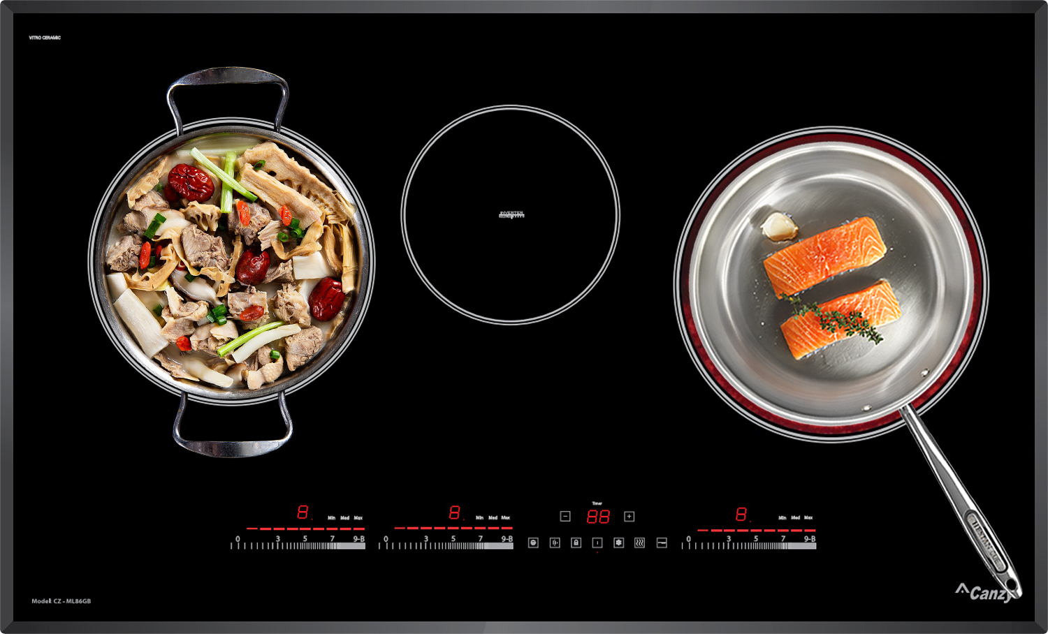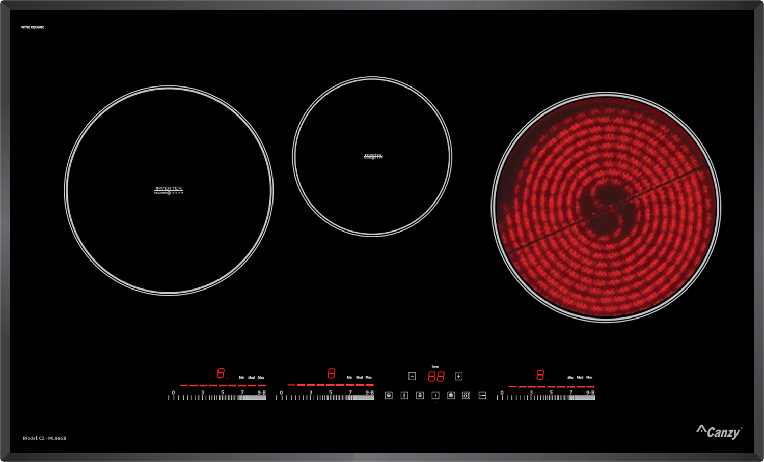 Bếp điện từ Canzy CZ-ML86GB gồm 3 vùng nấu với tổng công suất chia sẻ là 6800W. Vùng nấu từ lớn với công suất là 2300W khi kích hoạt tính năng nấu siêu nhanh Booster công suất lên tới 3000W. Vùng nấu từ nhỏ với công suất là 1200W khi kích hoạt tính năng nấu siêu nhanh Booster công suất lên tới 1600W. Vùng nấu hồng ngoại trang bị mâm nhiệt Hi-light với công suất tối đa lên tới 2200W. Chức năng Booster nấu siêu nhanh, tuy nhiên thời gian tối đa mặc định dùng chức năng này là 10 phút/lần tránh quá tải.