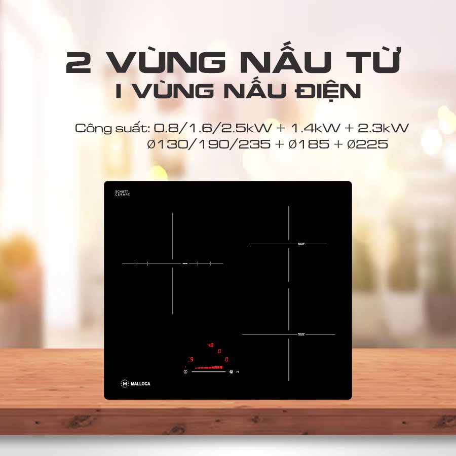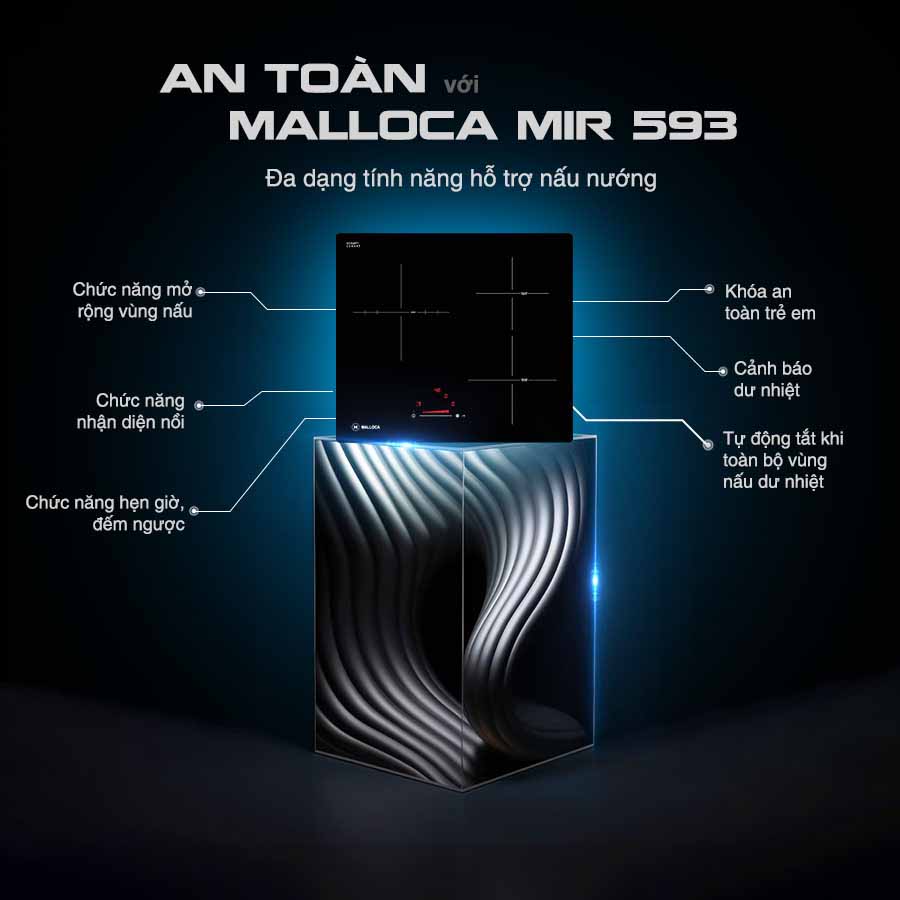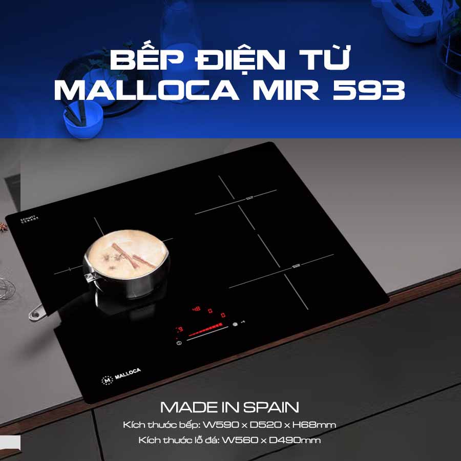 Bếp điện từ Malloca MIR 593 là mẫu bếp nhập khẩu Tây Ban Nha của Malloca. Bếp thiết kế kiểu vuông, Bảng điều khiển dạng Led, sử dụng chung cho 3 vùng nấu giúp điều khiển dễ dàng điều chỉnh mức công suất phù hợp giúp nấu các món ăn ngon hơn. Bếp có các tính năng hiện đại như Điều khiển dạng Slide (Dạng trượt), Booster (Nấu nhanh), Nhận diện vùng nấu, Cảnh báo chống tràn, Cảnh báo dư nhiệt.