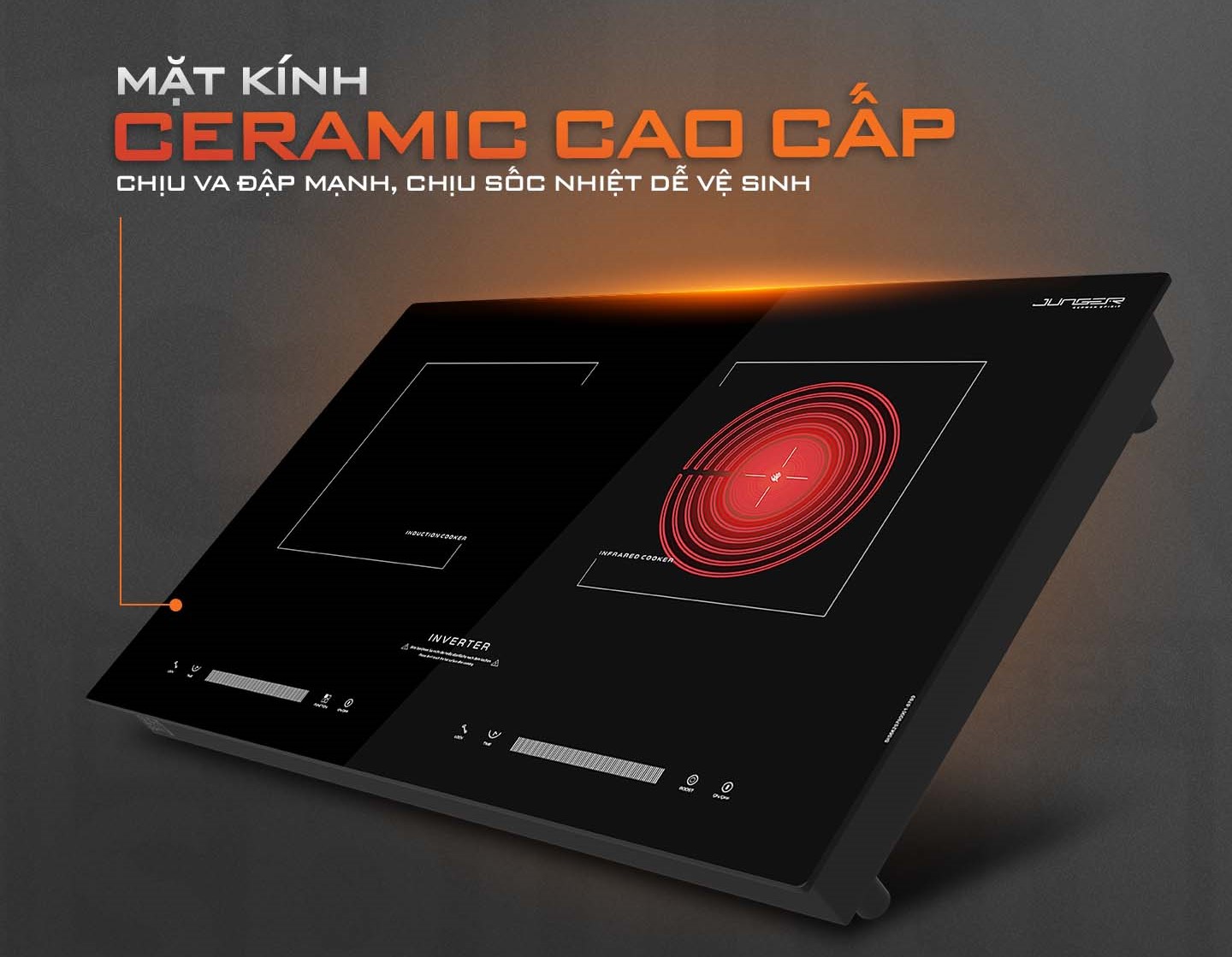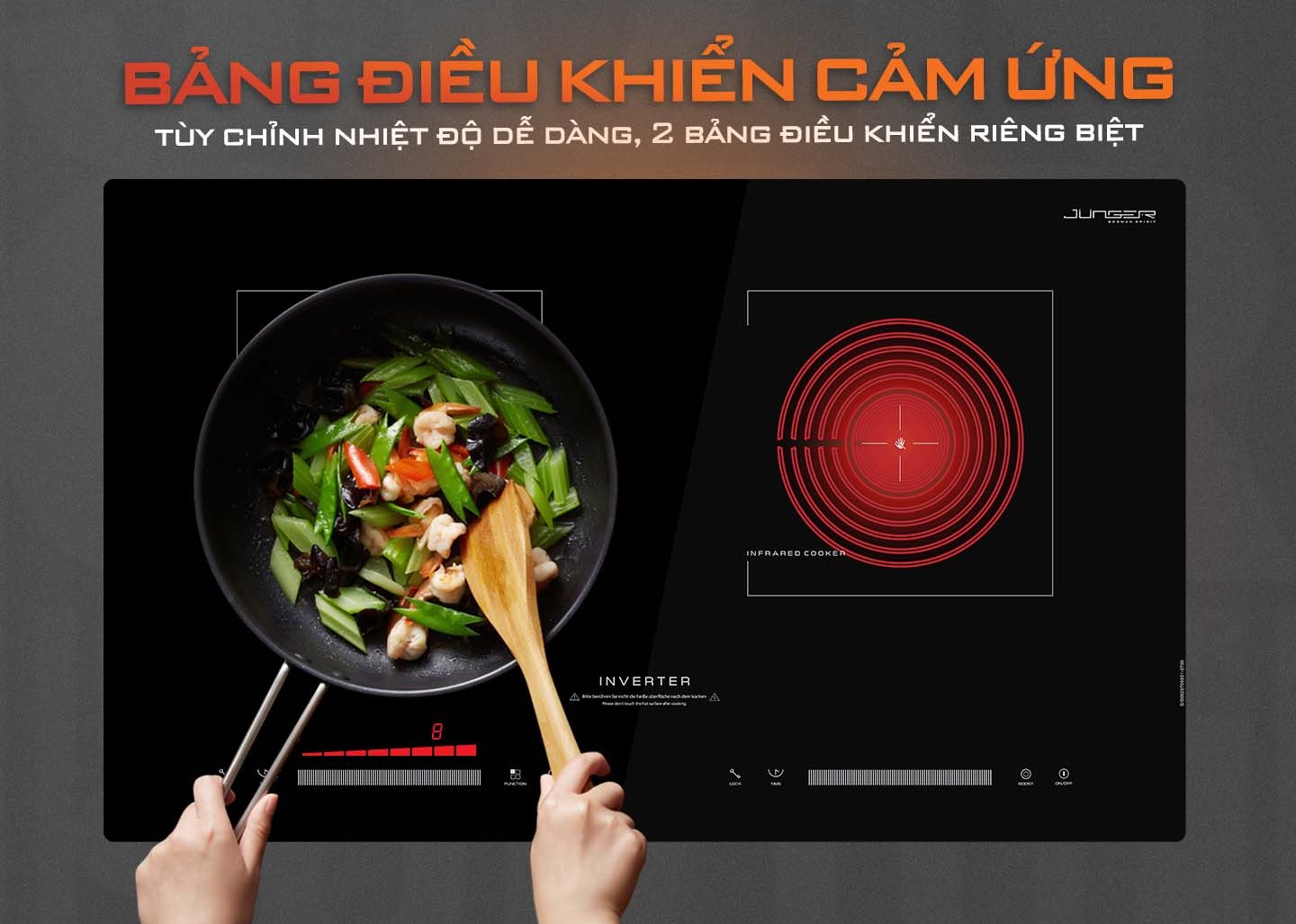 Bếp điện từ hồng ngoại Junger SIS-66 được thiết kế 2 vùng nấu riêng biệt toát lên vẻ độc đáo và sang trọng. Với 1 vùng bếp từ và 1 vùng bếp hồng ngoại, Junger SIS-66 có thể sử dụng cho tất cả các loại vật liệu khác nhau giúp công việc nấu nướng nhanh chóng và dễ dàng hơn bao giờ hết.