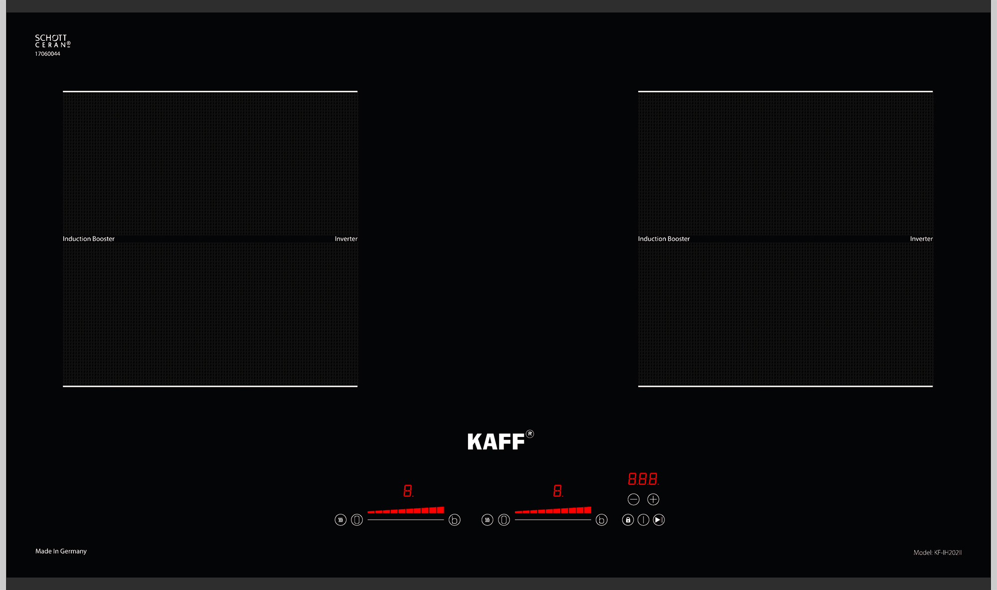 Bếp từ Kaff KF-IH202II sử dụng mặt kính Schott Ceran sản xuất tại Đức, mặt kính được làm từ chất liệu gốm thủy tinh có khả năng chịu nhiệt lên đến 1000°C, kháng sốc 750°C. Bề mặt kính chịu nóng lạnh cũng như sự thay đổi đột ngột của nhiệt độ. Độ giãn nở vì nhiệt thấp nên bếp hoạt động rất hiệu quả và cách nhiệt. Mặt bếp tản nhiệt nhanh và được cách điện an toàn với các linh kiện điện tử bên trong thân.