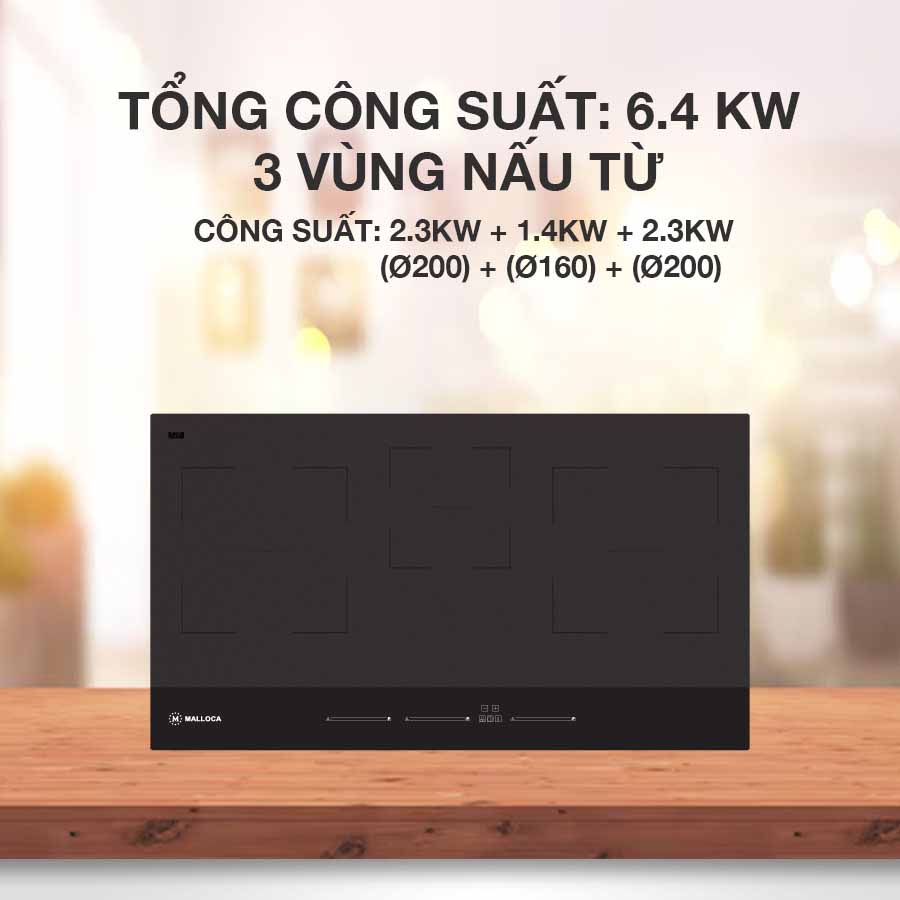 Bếp được thiết kế 3 vùng nấu, trong đó vùng nấu nhỏ ở giữa có công suất nấu 1.4kW (đường kính 160 mm) và 2 vùng nấu lớn 2 bên đều có công suất nấu 2.3kW (đường kính 200 mm). Người dùng có thể sử dụng cả 3 vùng nấu cùng lúc để nấu 3 món khác nhau mà không cần băn khoăn nấu món gì trước, món gì sau, rất tiện lợi và tiết kiệm thời gian. Bếp có tổng công suất nấu lên đến 6.4kW cùng với các tính năng tiện ích, sẽ mang đến cho bạn những trải nghiệm nấu ăn tuyệt vời.