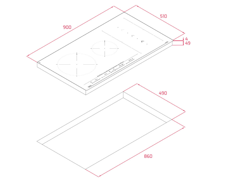 Kích thước của bếp từ là 900 x 510 x 53 mm, cho phép người dùng nấu cùng lúc 5 món ăn.