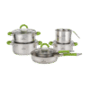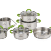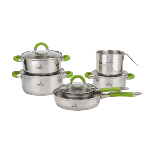 Bộ nồi Kieler RW-1003 sở hữu gam màu bạc và cách điện thêm quai cầm màu xanh để tạo điểm nhấn.