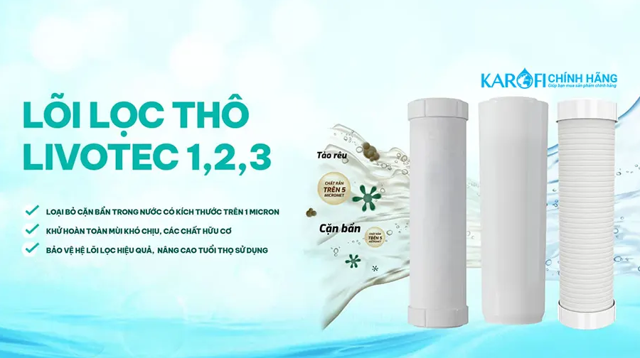 Hệ lõi lọc thô Livotec 1,2,3 loại bỏ cặn bẩn trong nước có kích thước trên 1 micron, khử hoàn toàn mùi khó chịu, các chất hữu cơ… bảo vệ hệ lõi lọc hiệu quả, nâng cao tuổi thọ sử dụng.